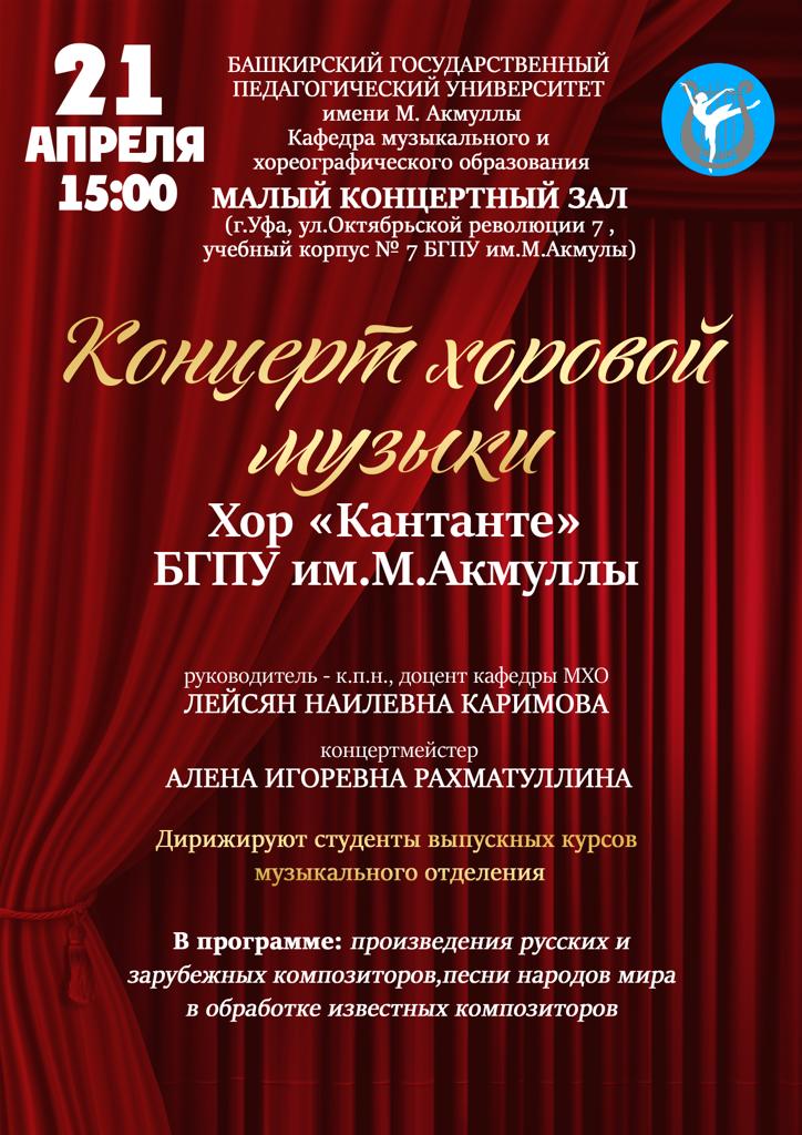 21 апреля 2022г. в 15:00 в Малом концертном зале корпуса № 7 БГПУ им. М. Акмуллы состоится концерт хоровой музыки с участием хора «Кантанте» кафедры музыкального и хореографического образования под руководством к.п.н., доцента Лейсан Наилевны Каримовой.