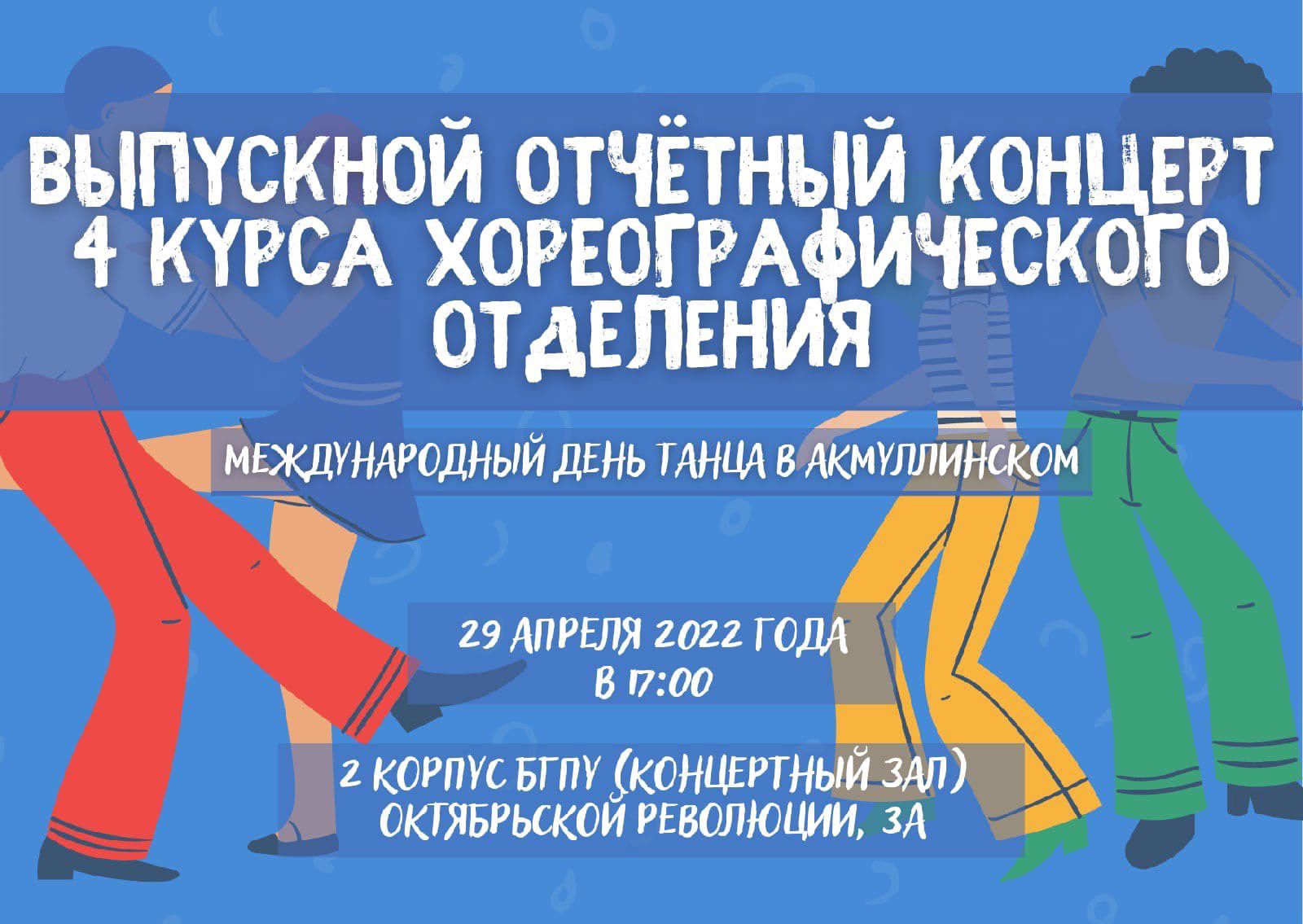 29 апреля 2022г. в честь празднования Международного дня танца студенты 4 курса хореографического отделения кафедры МХО дадут Выпускной Отчётный концерт! В программе хореографические постановки различных стилей и направлений. Хореографами-постановщиками являются преподаватели кафедры и сами выпускники!