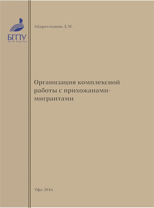 В рамках реализации плана мероприятий по обеспечению подготовки специалистов с углубленным знанием истории и культуры ислама в БГПУ им. М. Акмуллы подготовлено и выпущено учебное пособие «Организация комплексной работы с прихожанами-мигрантами», автором которой стал директор Межведомственного научно-исследовательского центра развития мусульманского образования БГПУ им. М. Акмуллы, кандидат философских наук, доцент Данияр Абдрахманов. В учебном пособии рассмотрены демографические, социально-экономические, религиозные и этнокультурные факторы в миграционных процессах, теоретические и практические аспекты процессов интеграции мигрантов, организация работы с прихожанами-мигрантами. Приведены практические и методические рекомендации.