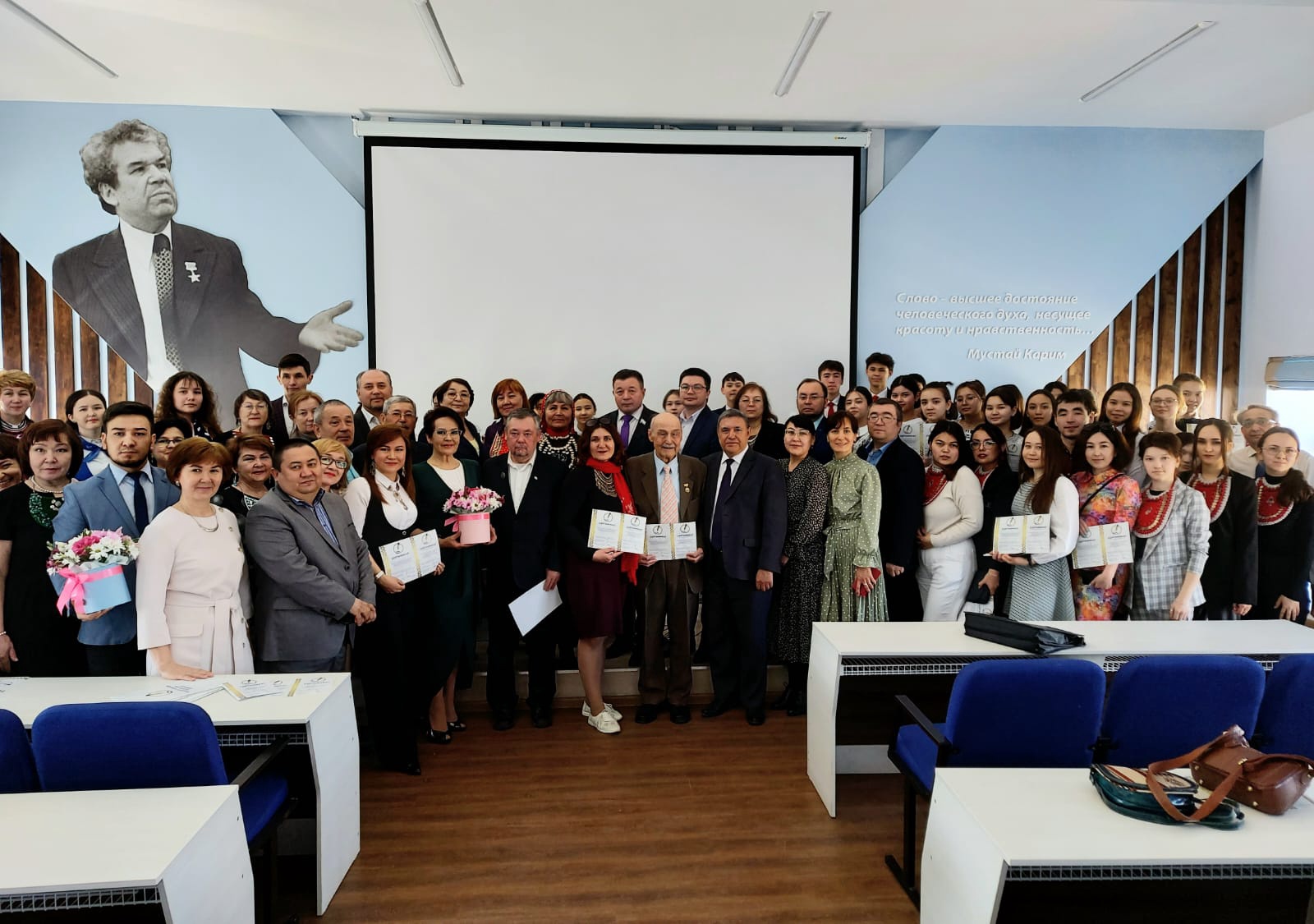 В именной аудитория Мустая Карима диктант  писали участники, которые свободно владеют башкирским языком. Для них текст читала легендарный диктор башкирского телевидения, заслуженный работник печати и массовой информации РБ, заслуженный работник культуры РФ Флюра Мурзина.