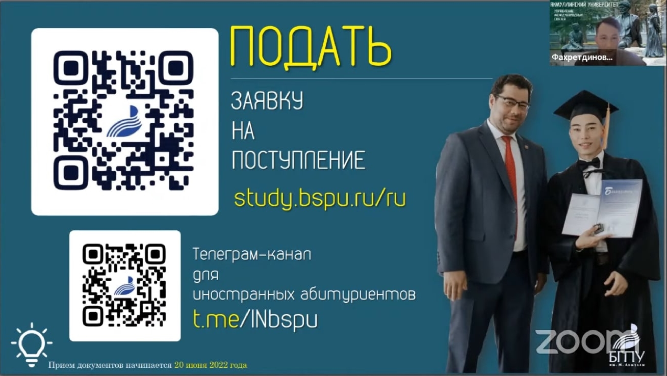 Начальник отдела международного сотрудничества Акмуллинского университета Тимур Фахретдинов рассказал участникам выставочных мероприятий об уникальной возможности получить высшее образование в Республике Башкортостан в БГПУ им. М. Акмуллы. Главными темами его выступления стали вопросы, которые касались направлений подготовки, стоимости обучения и проживания, особенностей предстоящей приемной кампании.