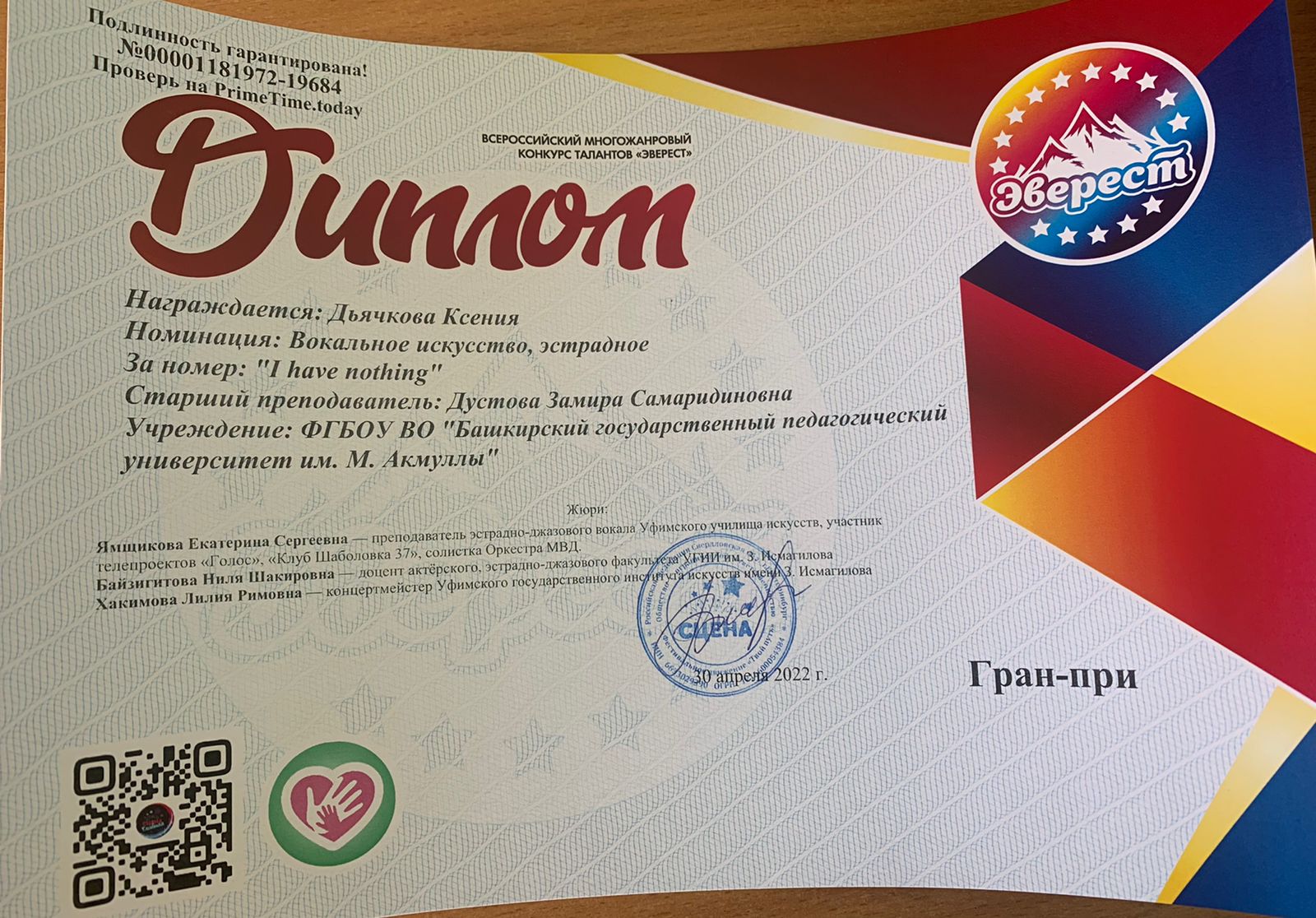 По итогам конкурсного прослушивания студентка БГПУ им. М. Акмуллы Ксения Дьячкова заняла первое место в номинации «Вокальное искусством, получив от членов жюри наивысшие оценки. А по результатам всего конкурса стала обладательницей Гран-при.