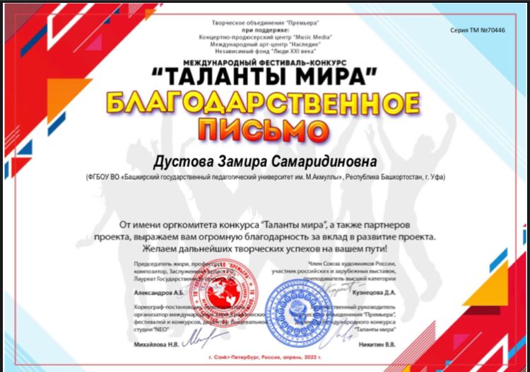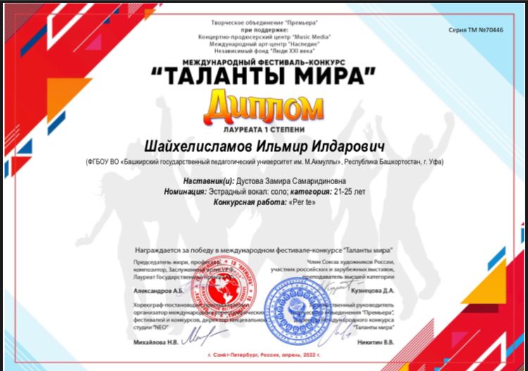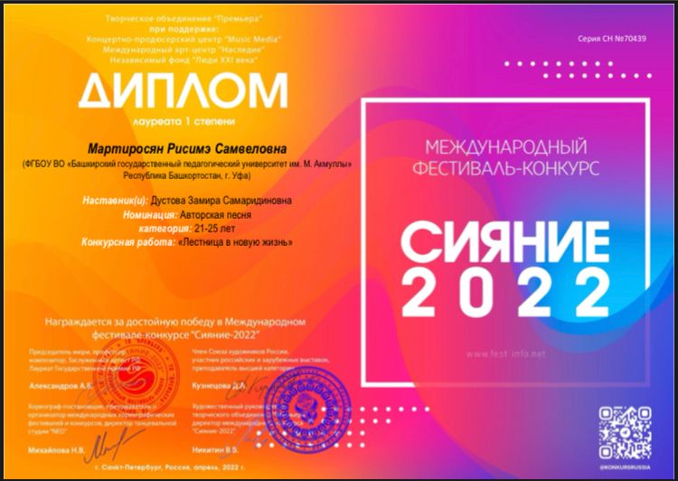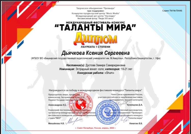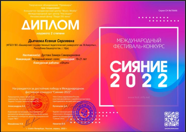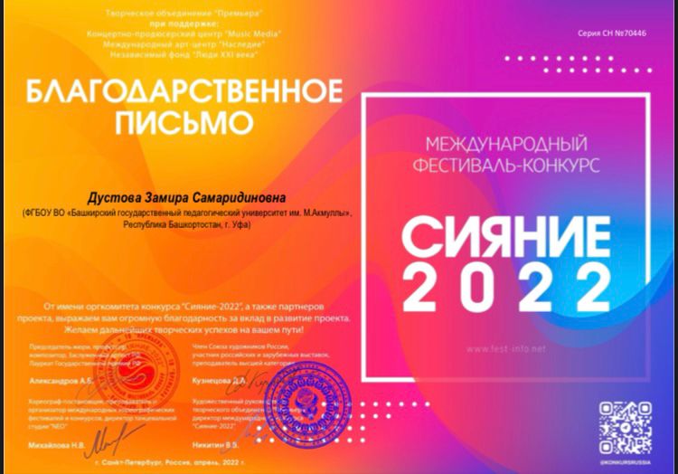 Студенты Института педагогики БГПУ им. М. Акмуллы вошли в число победителей двух Международных фестивалей-конкурсов: «Сияние 2022» и «Таланты мира».