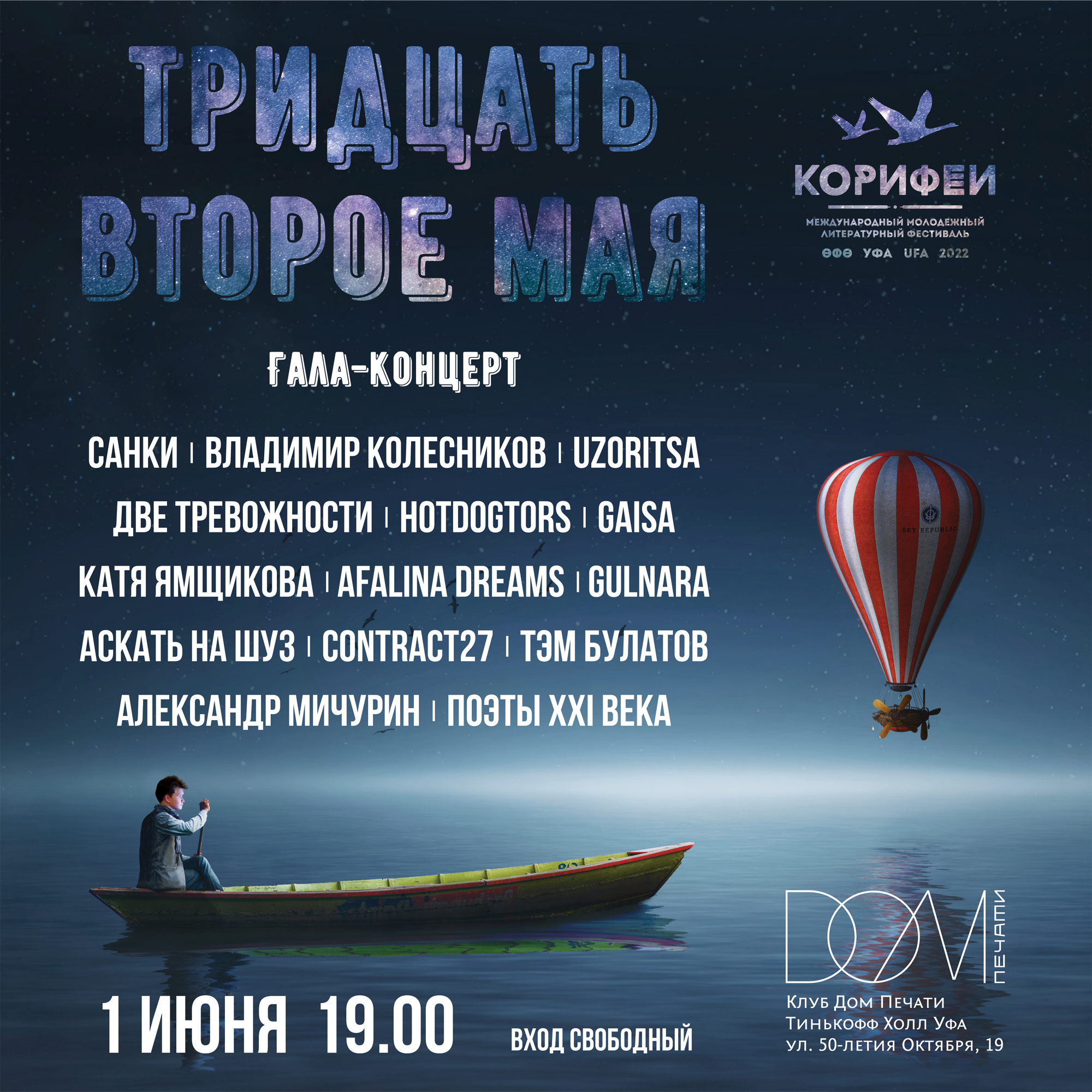 Кульминацией фестиваля станет гала-концерт «Тридцать второе мая», на котором выступят известные поэты и музыканты, а также молодые авторы. Концерт пройдет в клубе «Дом Печати» («Тинькофф Холл») ул. 50-летия Октября, 19. Начало в 19:00 часов. Вход свободный.