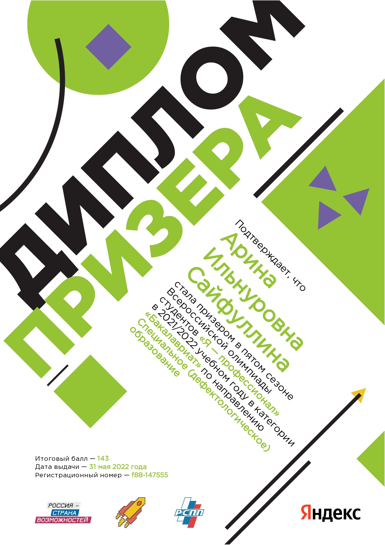 В результате студентка четвертого курса Института педагогики БГПУ им. М.Акмуллы Арина Сайфуллина вошла в число призёров по направлению «Специальное (дефектологическое) образование». Все дипломанты пятого сезона олимпиады «Я — профессионал» получили призы: льготы при поступлении в магистратуры, аспирантуры и ординатуры ведущих российских вузов, и возможность пройти стажировку в крупной профильной компании.