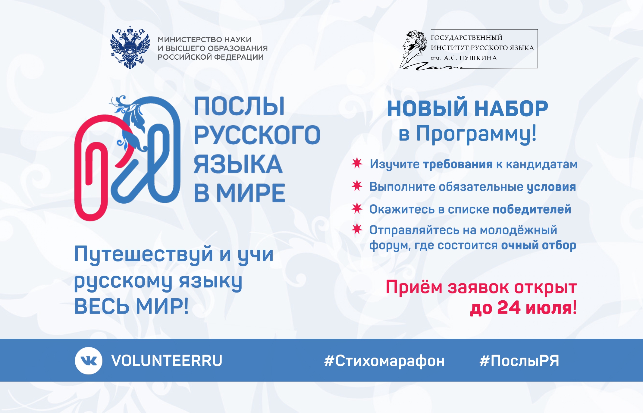 Государственный институт русского языка им. А.С. Пушкина проводит новый набор волонтёров Международной программы «Послы русского языка в мире».