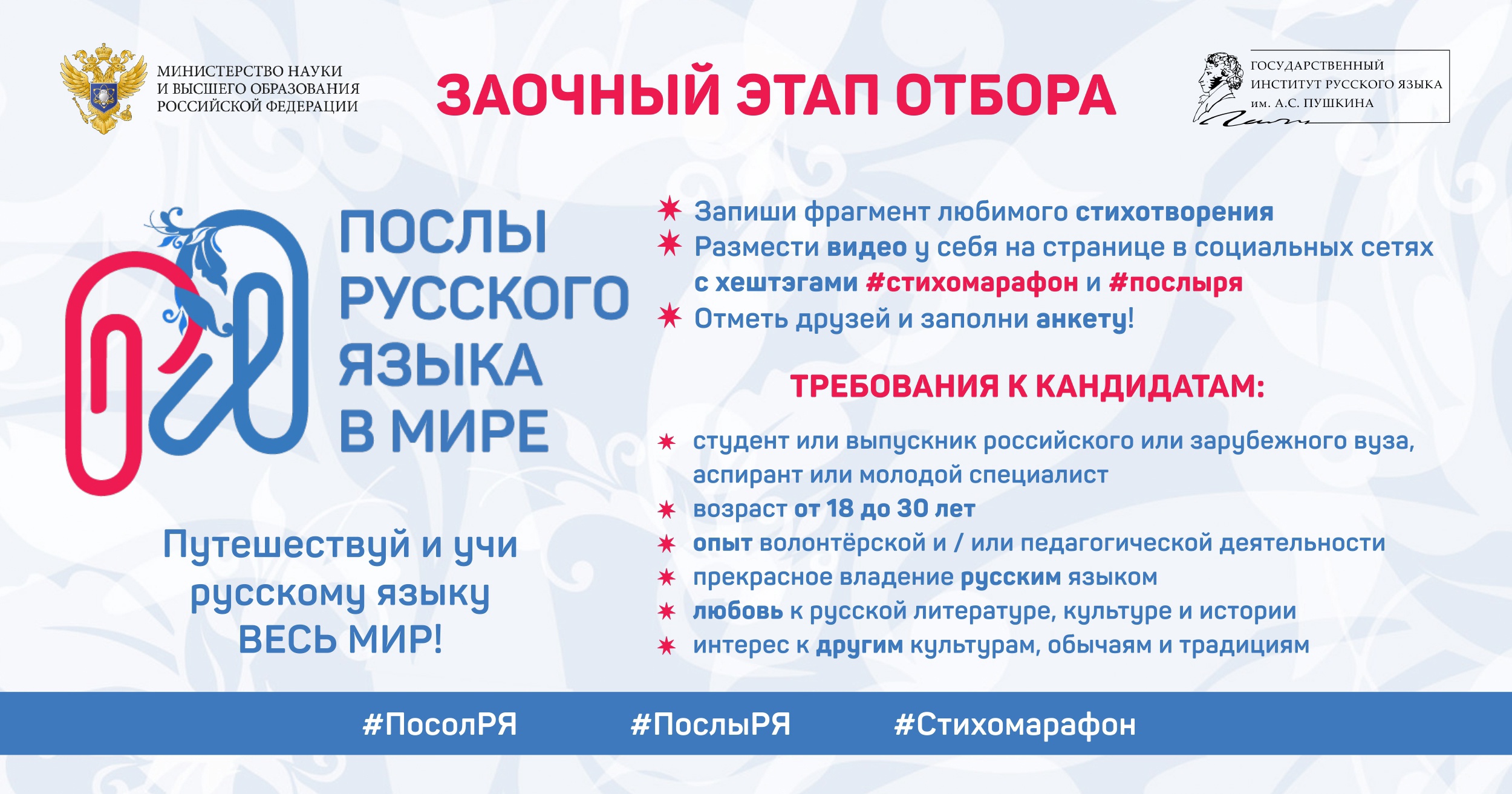 Для участия в конкурсном отборе приглашаются студенты, аспиранты и молодые специалисты в возрасте от 18 до 30 лет с опытом волонтёрской или педагогической деятельности, которые знают и любят русский язык и культуру, хотят развиваться в сфере межкультурной коммуникации и международных отношений.