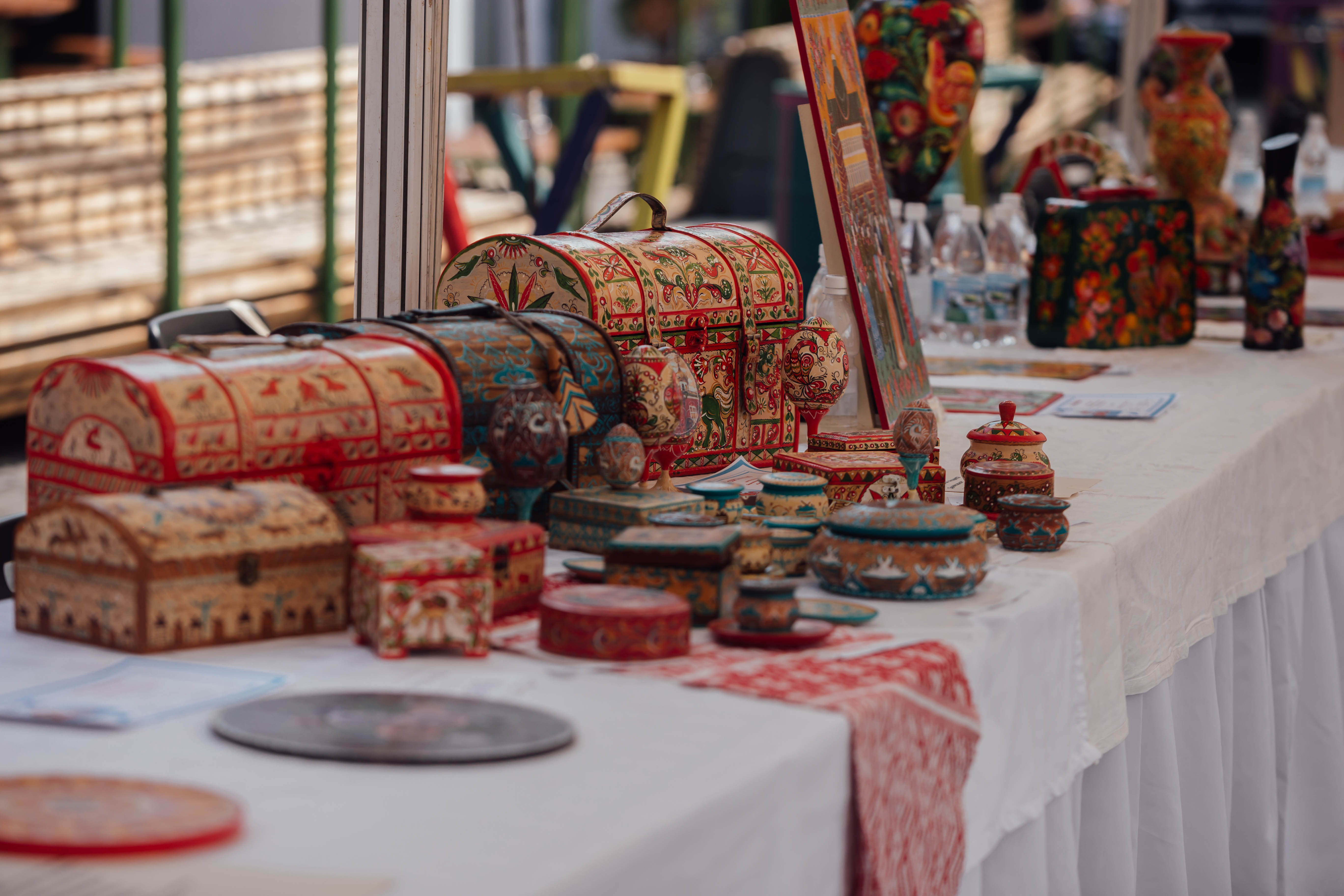 В выставочных шатрах расположились мастера росписи по ткани, стеклу, дереву и металлу, вышивке, плетению кружев и из бисера, ручному ткачеству и валянию из шерсти, керамике, резьбе по дереву, работе с камнем и металлом, пчеловодству.