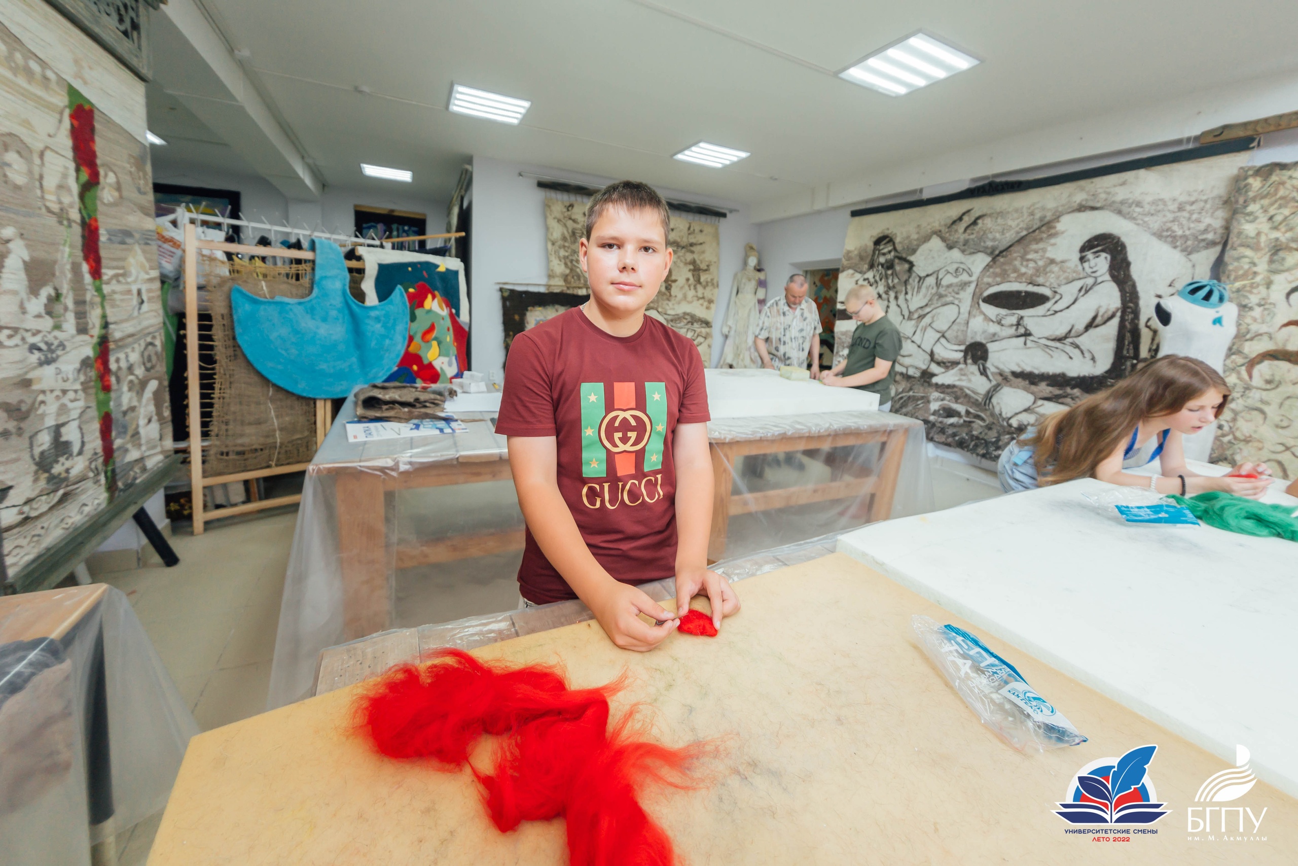 10 июля ребята посетили Центр художественного войлока БГПУ им. М.Акмуллы. Приветствовал участников смены руководитель подразделения Талгат Масалимов. Он ознакомил детей с декоративными панно, костюмами и объемными арт-объектами, представленными в Центре. Все экспонаты выполнены студентами художественно-графического факультета с использованием различных техник и приемов обработки шерсти.
