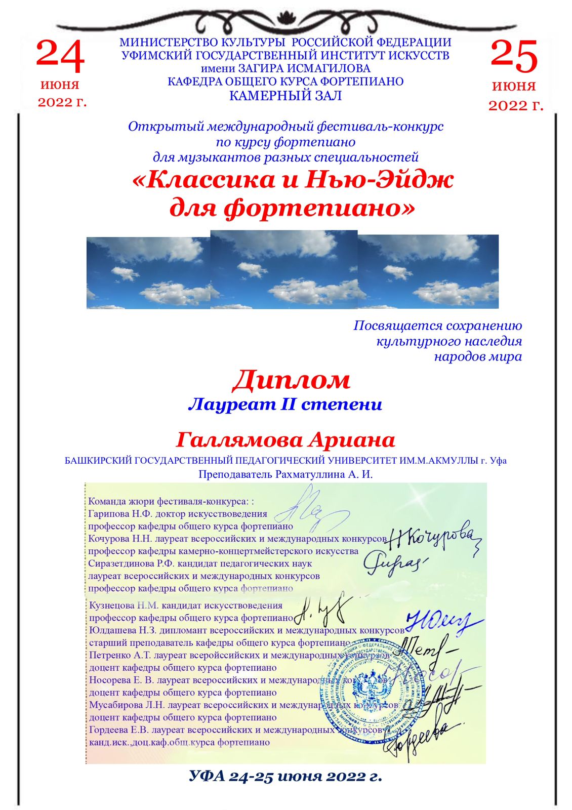 24-25 июня 2022 года в Камерном зале Уфимского государственного института искусств имени Загира Исмагилова прошел VI Открытый международный фестиваль-конкурс по курсу фортепиано «Классика и Нью-Эйдж для фортепиано», посвященный сохранению культурного наследия народов мира. Участниками стали учащиеся детских музыкальных, средних специальных и высших учебных заведений республики, регионов России и зарубежья, для которых инструмент фортепиано не является основным.