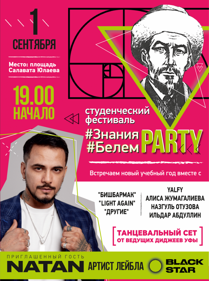 Гостей #ЗнанияPARTY ждет большая дискотека от ведущих диджеев Уфы, праздничный концерт с YALFY, Алисой Жумагалиевой, Назгуль Отузовой, Ильдаром Абдуллиным, группами «Бишбармак», «Light Again», «Другие». Хедлайнер – артист лейбла Black Star – Natan.