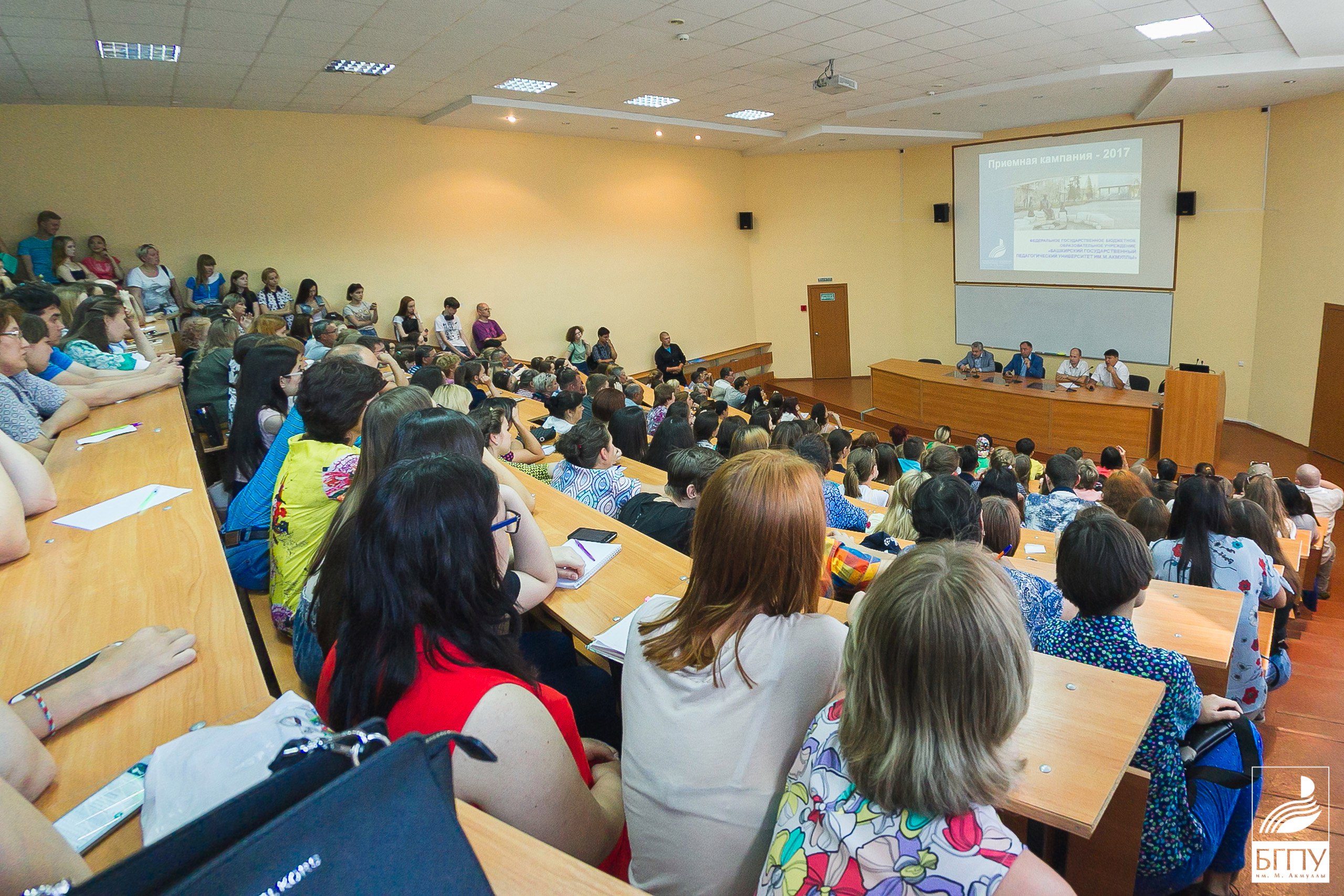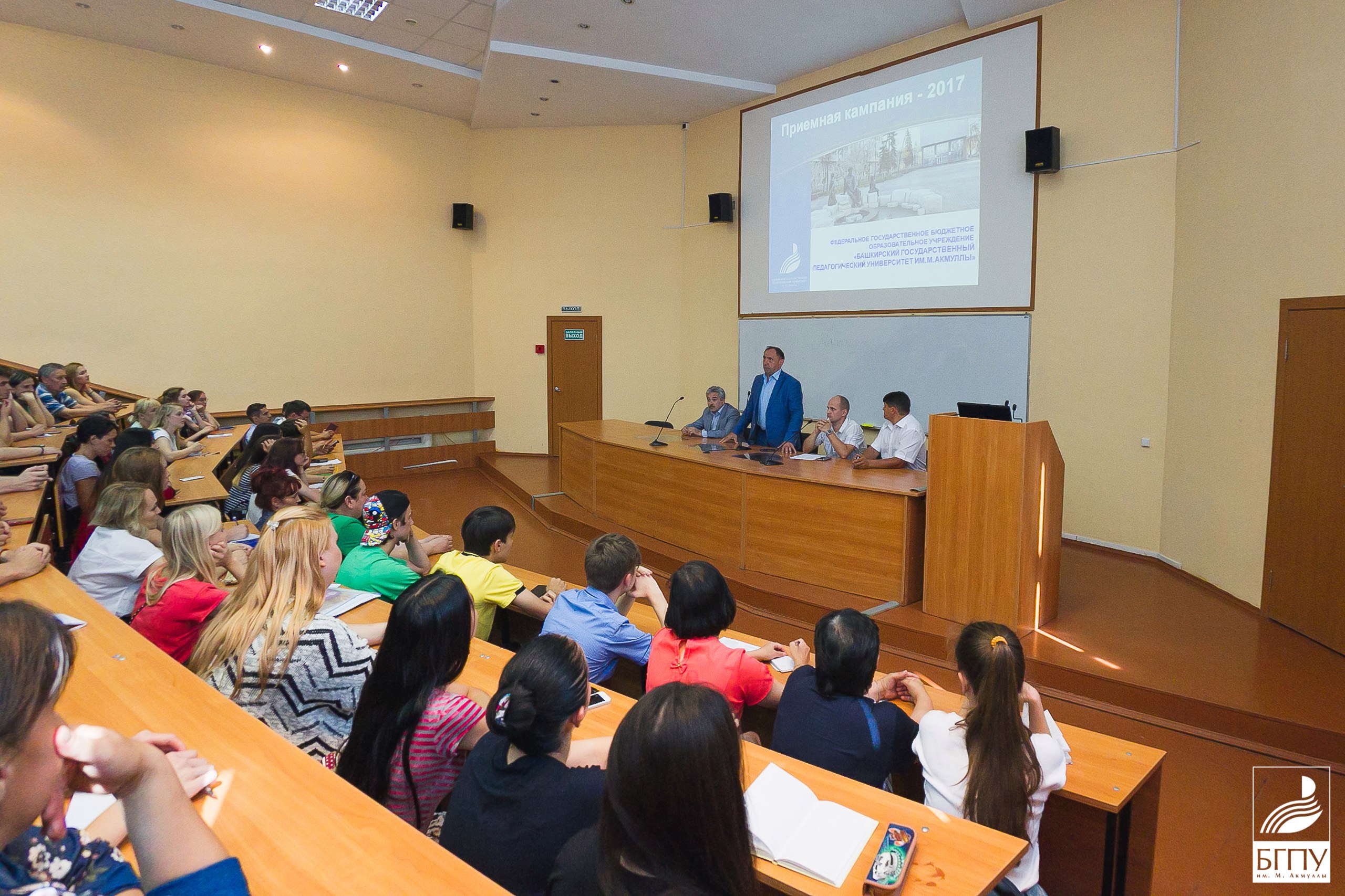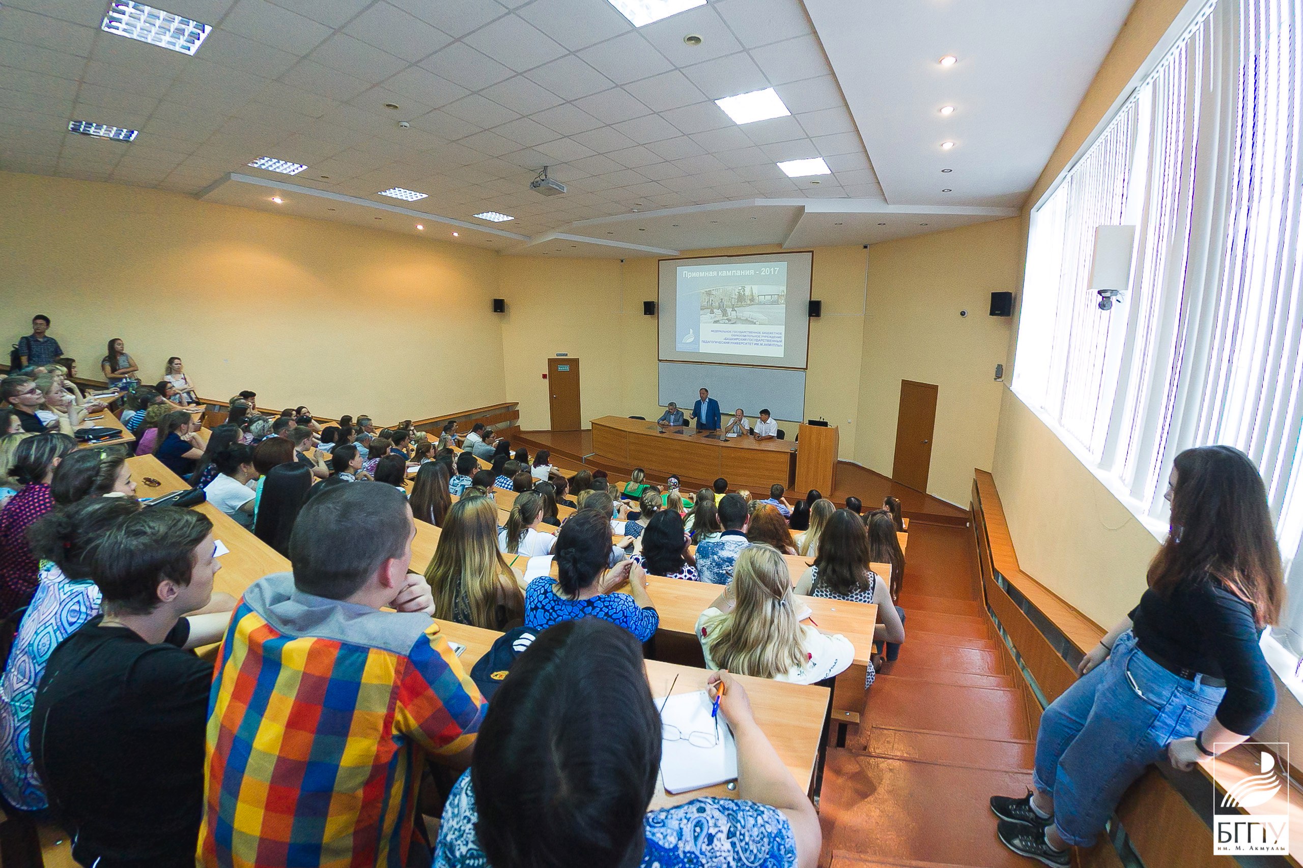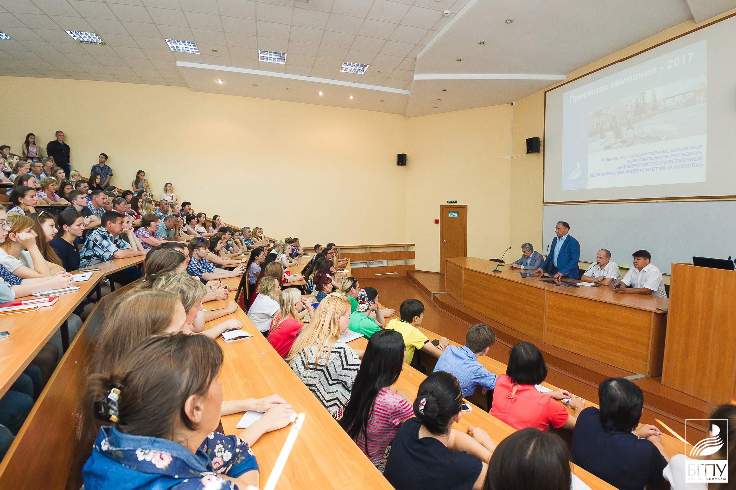 3 августа 2017 года состоялась встреча абитуриентов с руководством университета. На встрече обсуждалась работа приемной кампании – 2017, сложившаяся конкурсная ситуация. Ректор БГПУ им. М. Акмуллы Р. М. Асадуллин ответил на все интересующие и наиболее актуальные вопросы родителей абитуриентов. А. Ф. Мустаев, проректор по учебной работе, рассказал всем присутствующим о видах и размерах государственной академической стипендии. В. А. Шаяхметов, проректор по социальной и воспитательной работе, ответил на вопросы, касающиеся дальнейших мероприятий, связанных с заселением в общежития, прохождением медицинского осмотра, отрабатыванием летнего трудового семестра. В заключение встречи выступил исполняющий обязанности председателя приемной комиссии Е. В. Данилов, который охарактеризовал сложившуюся конкурсную ситуацию. «Сегодня прошла первая волна зачисления студентов на бюджетную основу обучения, было зачислено 440 человек, ожидается вторая волна зачисления студентов. Каждый день на сайте опубликовываются новые рейтинг-листы с пофамильным перечнем студентов, рекомендованных к зачислению в университет, а также рейтинг-листы размещены на стендах в университете, во 2 корпусе. Следите за новостями!» - прокомментировал Е. В. Данилов.