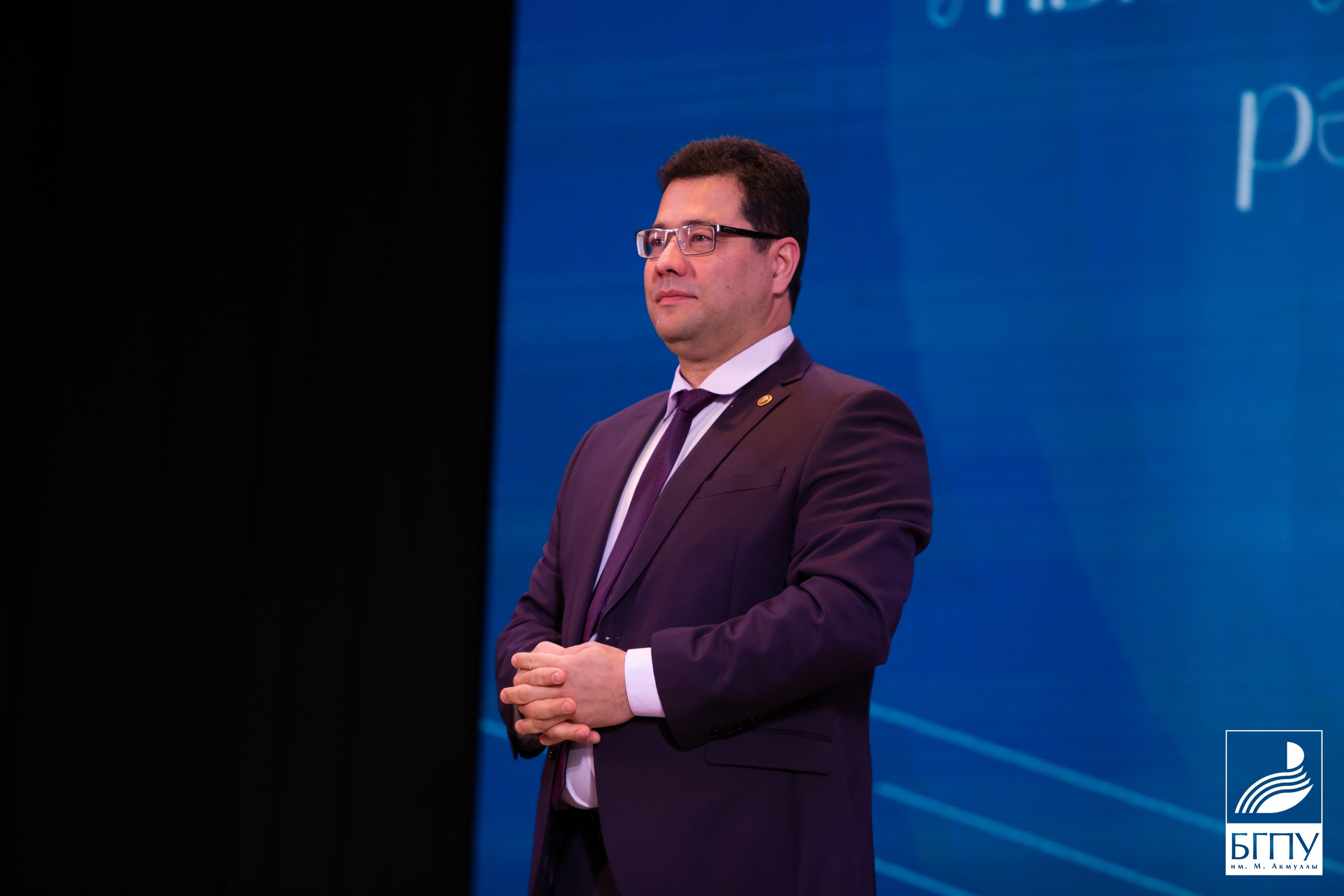 Со сцены прозвучало видеопоздравление Министра просвещения России Сергея Кравцова. Далее собравшихся поздравил ректор Башгоспедуниверситета Салават Сагитов.