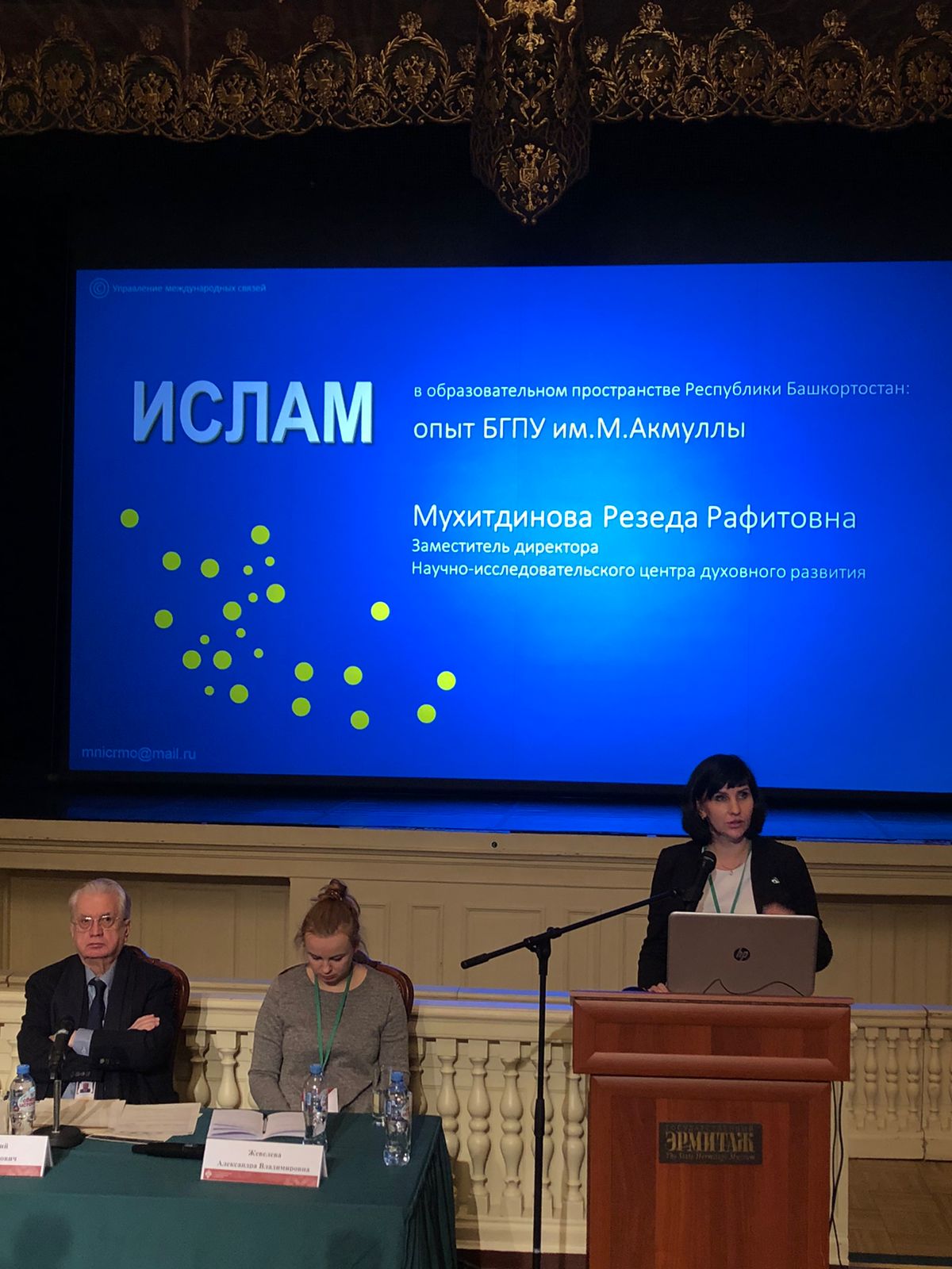 В пленарном заседании приняла участие заместитель директора Научно-исследовательского центра духовного развития БГПУ им. М.Акмуллы Резеда Мухитдинова. В своём выступлении отметила, что важной концептуальной задачей является подготовка светских специалистов для работы в религиозных образовательных учреждениях исламской направленности, а образование, построенное на основе учёта многовекового духовно-культурного наследия многонационального народа России, есть залог сохранения и укрепления гражданского мира, согласия, взаимопонимания и добрососедства.