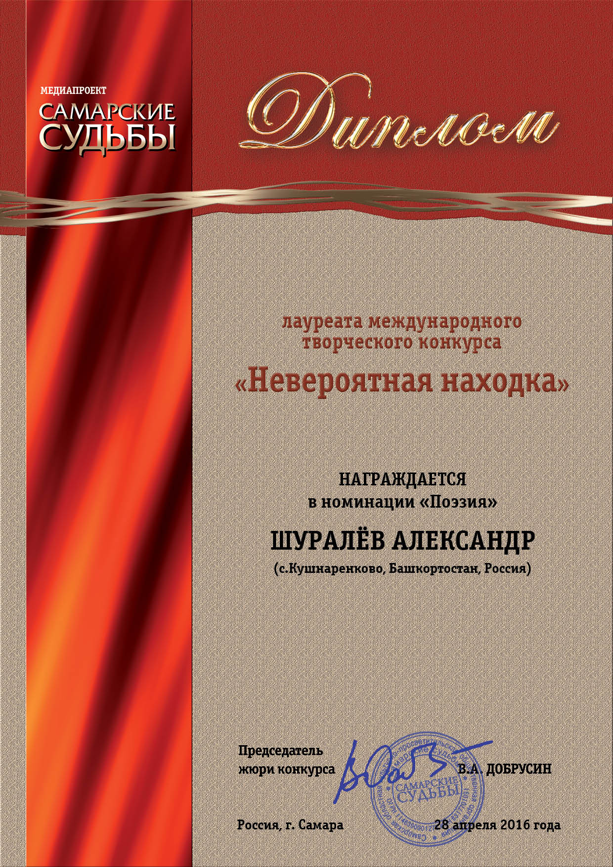 В  конкурсе «Невероятная находка», посвящённом Году российского кино, приняли участие 333 русскоязычных автора из 28 стран. А.М. Шуралёв награждён дипломом лауреата за художественное описание процесса педагогических открытий в стихотворении «В одной связке» (из дневника учителя) и метафорическое изображение человеческой души в стихотворении «Каскадёрка».