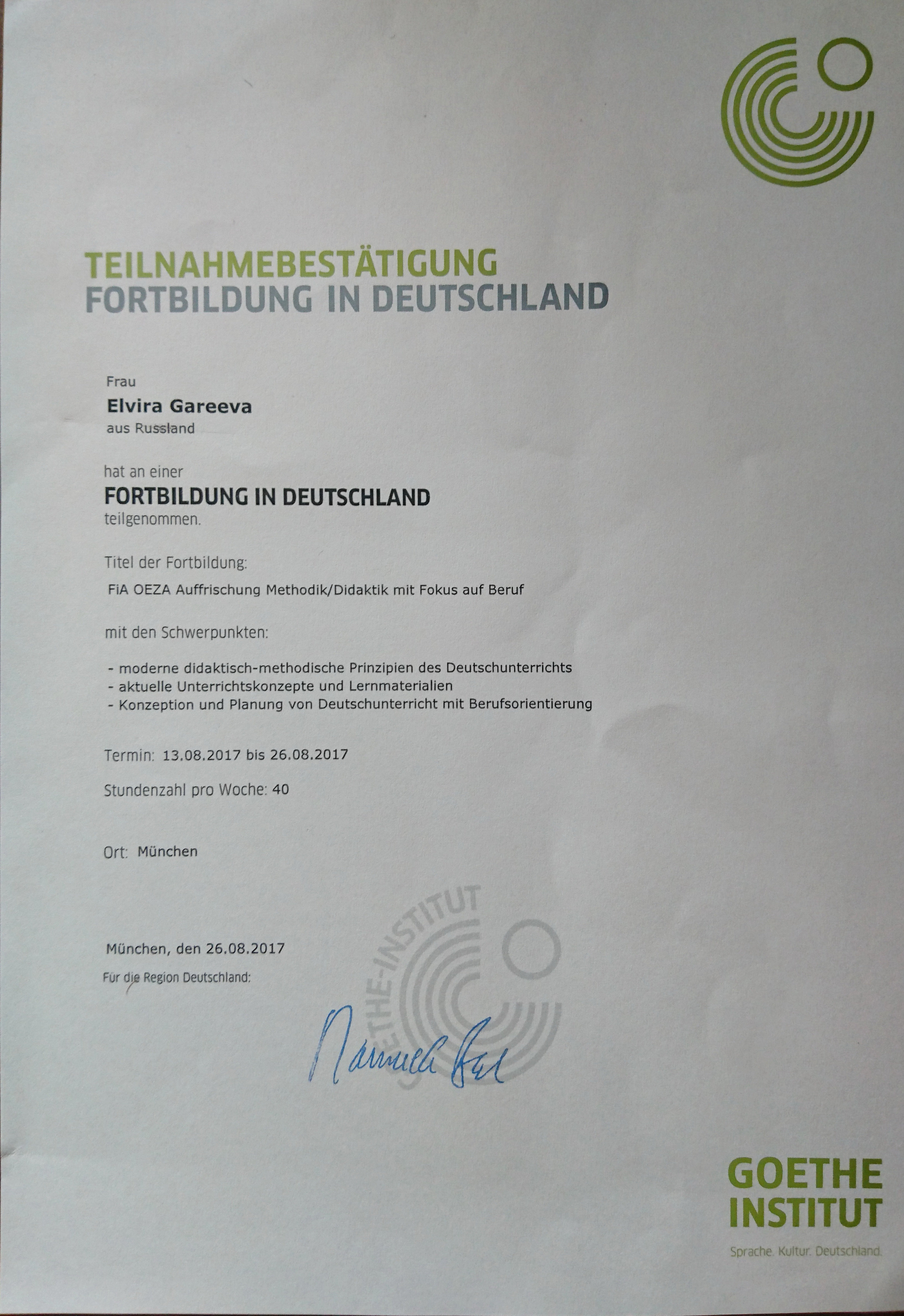 С  13 по 26 августа доцент кафедры методики преподавания иностранных языков и второго иностранного языка ИФОМК Э. А. Гареева пребывала в Германии. Эльвира Абдулгалимовна получила стипендию Немецкого культурного центра им. Гёте в Москве на поездку с целью участия в курсе повышения квалификации для преподавателей в г. Мюнхен.