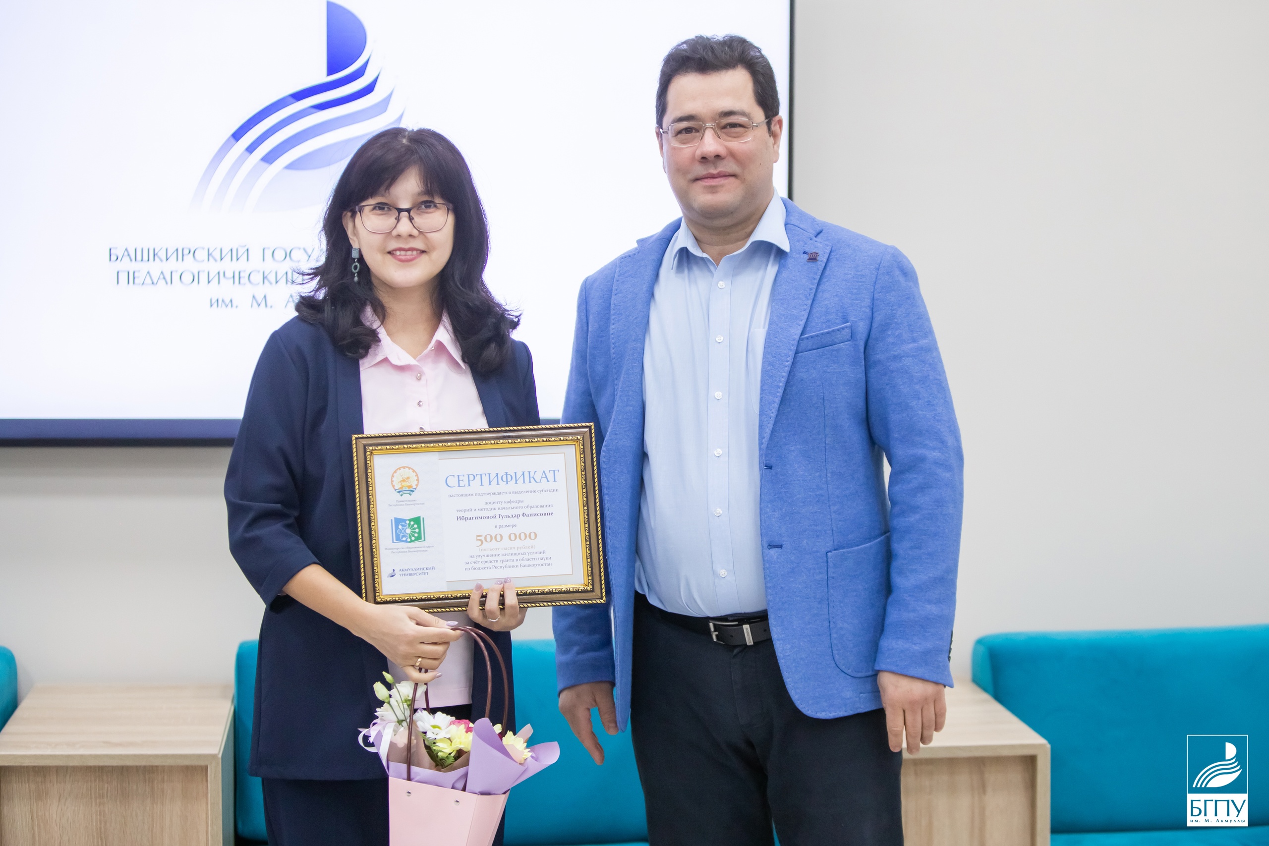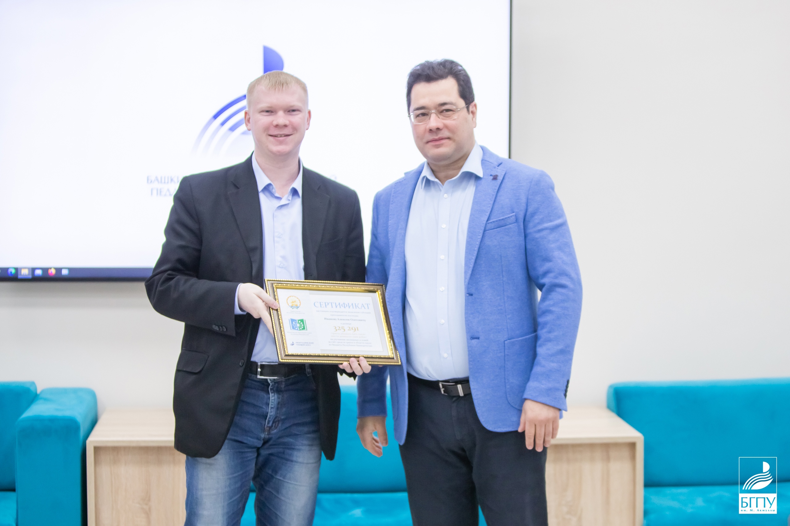 Денежные сертификаты получили старший научный сотрудник БГПУ им. М. Акмуллы Залия Батталова, доценты кафедры теорий и методик начального образования Гульдар Ибрагимова и Наталья Сандалова,  доцент кафедры физики и нанотехнологий Рамис Каримов, доцент кафедры теории и методики физической культуры и спорта Роман Кулешов, а также старший преподаватель кафедры башкирского языка и литературы Айтуган Куланчин. Сертификаты также вручили преподавателям Колледжа БГПУ им. М. Акмуллы Алексею ИвановуТатьяне ВасильевойНиките Санкину и Ильсияр Зайнуллиной.