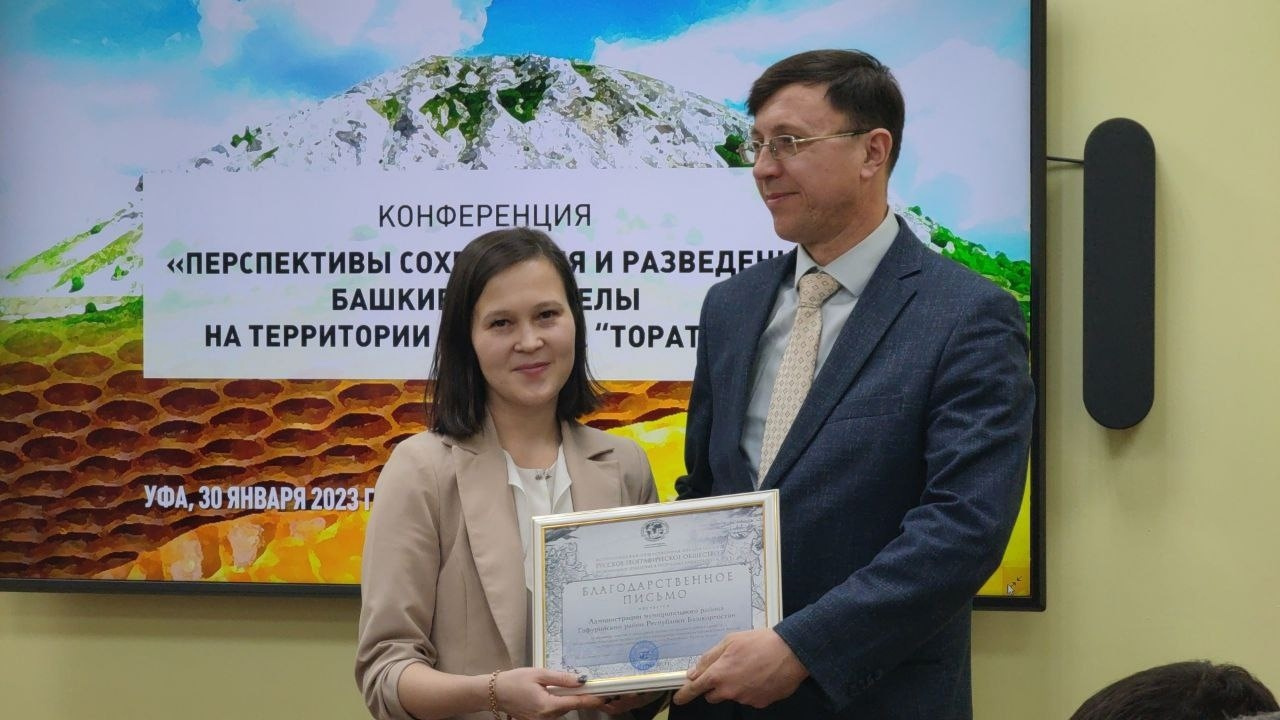 В завершение конференции исполнительный директор Башкирского отделения РГО Юлия Абдрахимова вручила благодарственные письма Русского географического общества главам муниципальных районов, на территории которых проходили исследования в рамках Гранта Главы Республики Башкортостан.