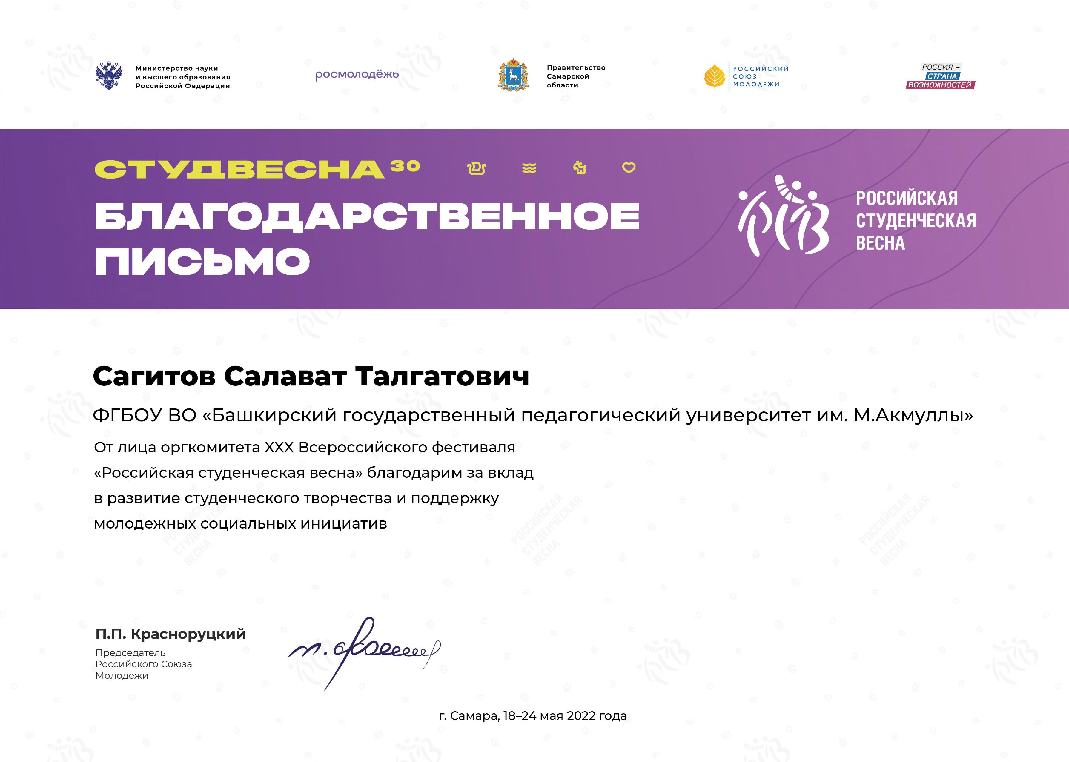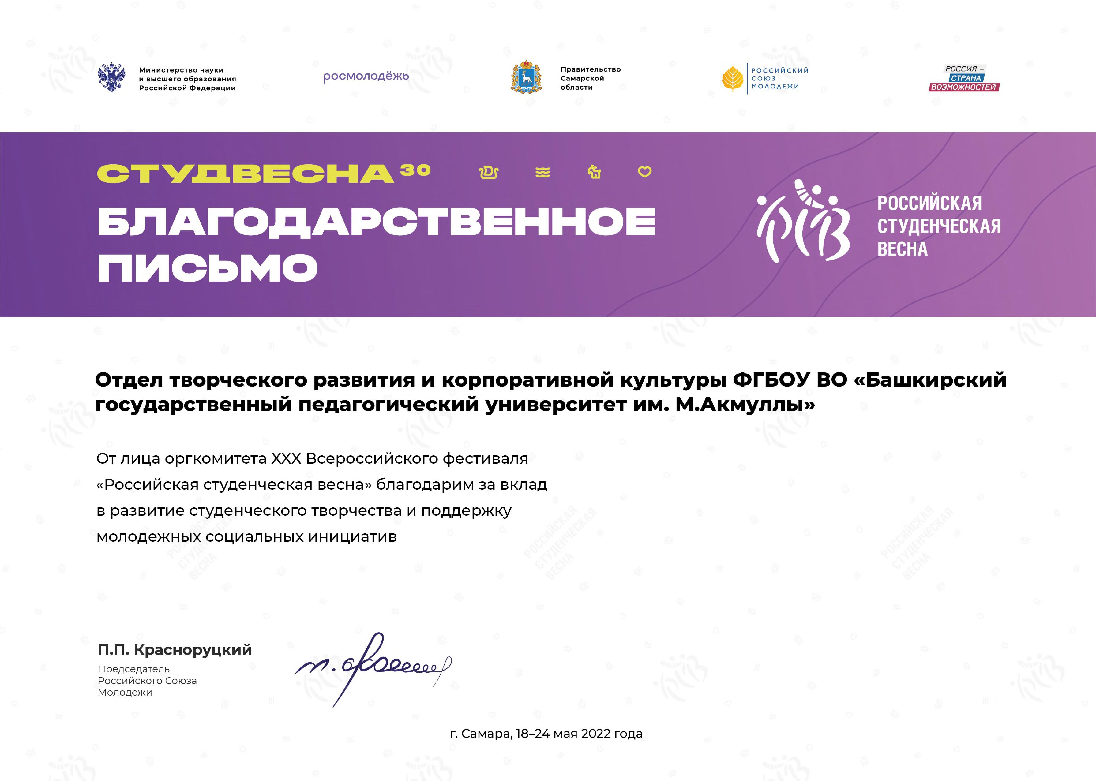 В адрес Акмуллинского университета поступили благодарственные письма от оргкомитета ХХХ Всероссийского фестиваля «Российская студенческая весна». От имени организаторов фестиваля Председатель Российского союза молодежи П.П. Красноруцкий поблагодарил ректора вуза Салавата Талгатовича Сагитова и отдел творческого развития и корпоративной культуры за вклад в развитие студенческого творчества и поддержку молодежных социальных инициатив.