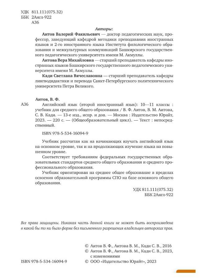 В центральном издательстве вышел новый учебник «Английский язык (второй иностранный язык)» для  10 −11 классов. Авторами издания являются Аитов Валерий Факильевич – доктор педагогических наук, заведующий кафедрой методики преподавания иностранных языков и 2-го иностранного языка Института филологического образования и межкультурных коммуникаций БГПУ им. М.Акмуллы, Аитова Вера Михайловна – старший преподаватель кафедры иностранных языков Башгоспедуниверситета и Кади Светлана Вячеславовна – старший преподаватель кафедры лингводидактики и перевода Санк-Петербургского политехнического университета Петра Великого.