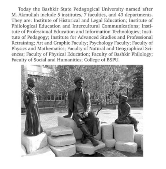 В учебнике 4 раздела: General English, ESP Texts, Business English, Questions to GE Topics. В содержание учебных материалов включены  также материалы по истории и культуре Республики Башкортостан, в том числе и информация о Башкирском государственном педагогическом университете им. М. Акмуллы.