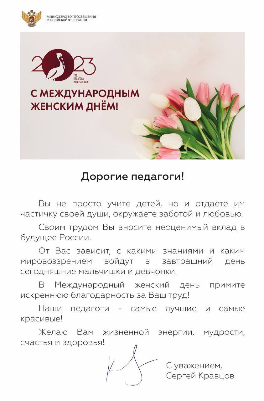 Поздравление педагогам от министра просвещения России Сергея Кравцова