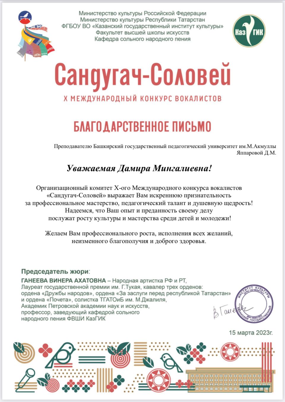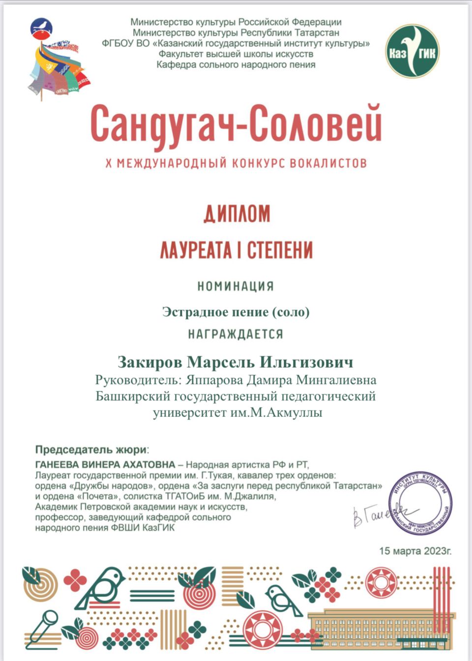Студент кафедры музыкального и хореографического образования Акмуллинского университета Марсель Закиров стал лауреатом 1 степени Международного конкурса вокалистов «Сандугач-Соловей» в номинации эстрадное пение. Руководителем стала старший преподаватель кафедры Института педагогики БГПУ им. М.Акмуллы Дамира Яппарова.