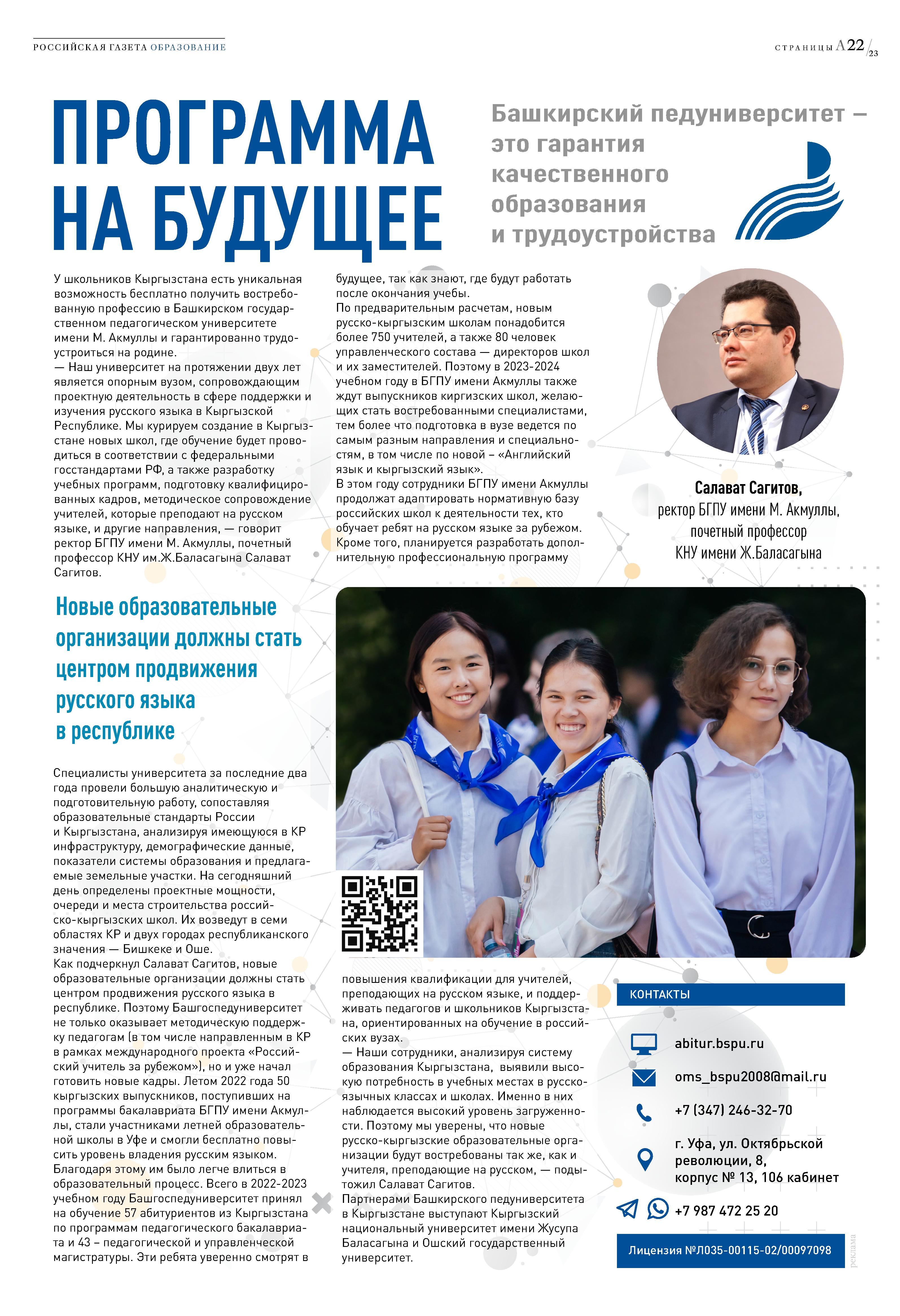 Выставке посвящен специальный выпуск «Российской газеты» в Киргизии, где также представлена информация об Акмуллинском университете.