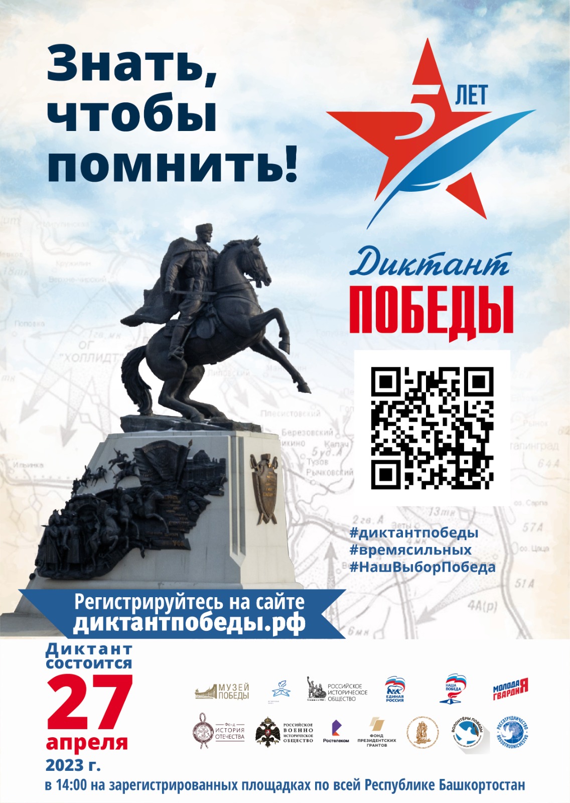 27 апреля 2023 года на региональных площадках по всей России, за рубежом, а также онлайн на сайте диктантпобеды.рф пройдет пятый юбилейный «Диктант Победы». Это международная историческая акция на тему событий Великой Отечественной войны.