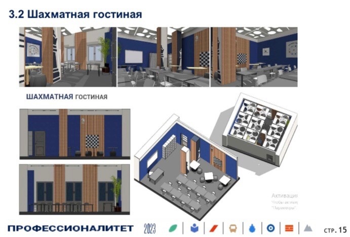 В шахматной зоне студенты смогут отрабатывать навыки в области базовых и новых видов физкультурно-спортивной деятельности. Для работы будет предоставлен необходимый инвентарь: интерактивная доска, офисное приложение, стол, стулья, шахматы, стеллаж, шахматные фигуры, шахматные часы и доска.
