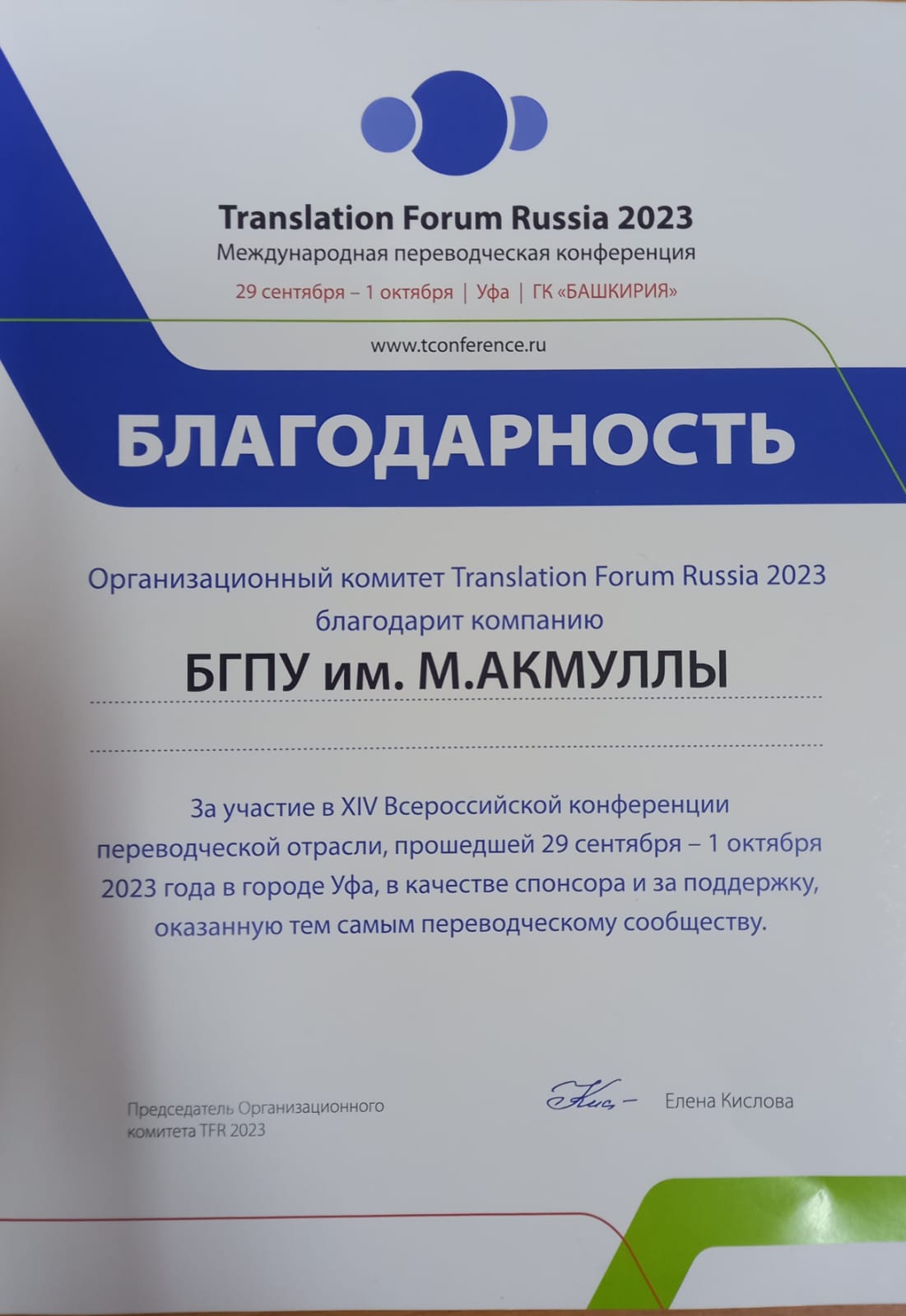 29 сентября 2023 года в Уфе стартовала конференция Translation Forum Russia – крупнейшая в России конференция отрасли переводов и локализации. Мероприятие приурочено к Международному дню перевода, который отмечается 30 сентября.  На торжественном открытии участников конференции приветствовал первый проректор по стратегическому развитию БГПУ имени М. Акмуллы Алмаз Мустаев.