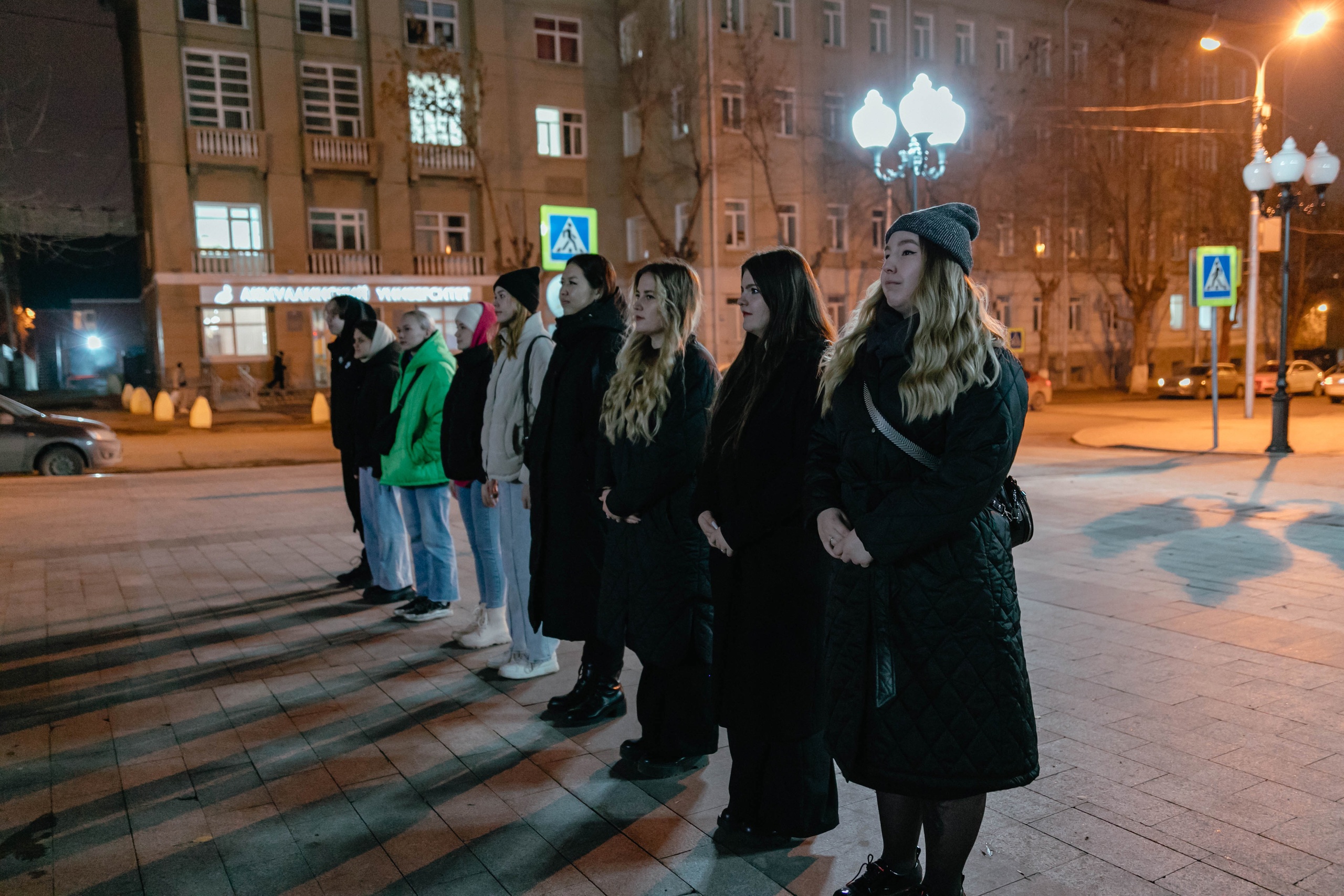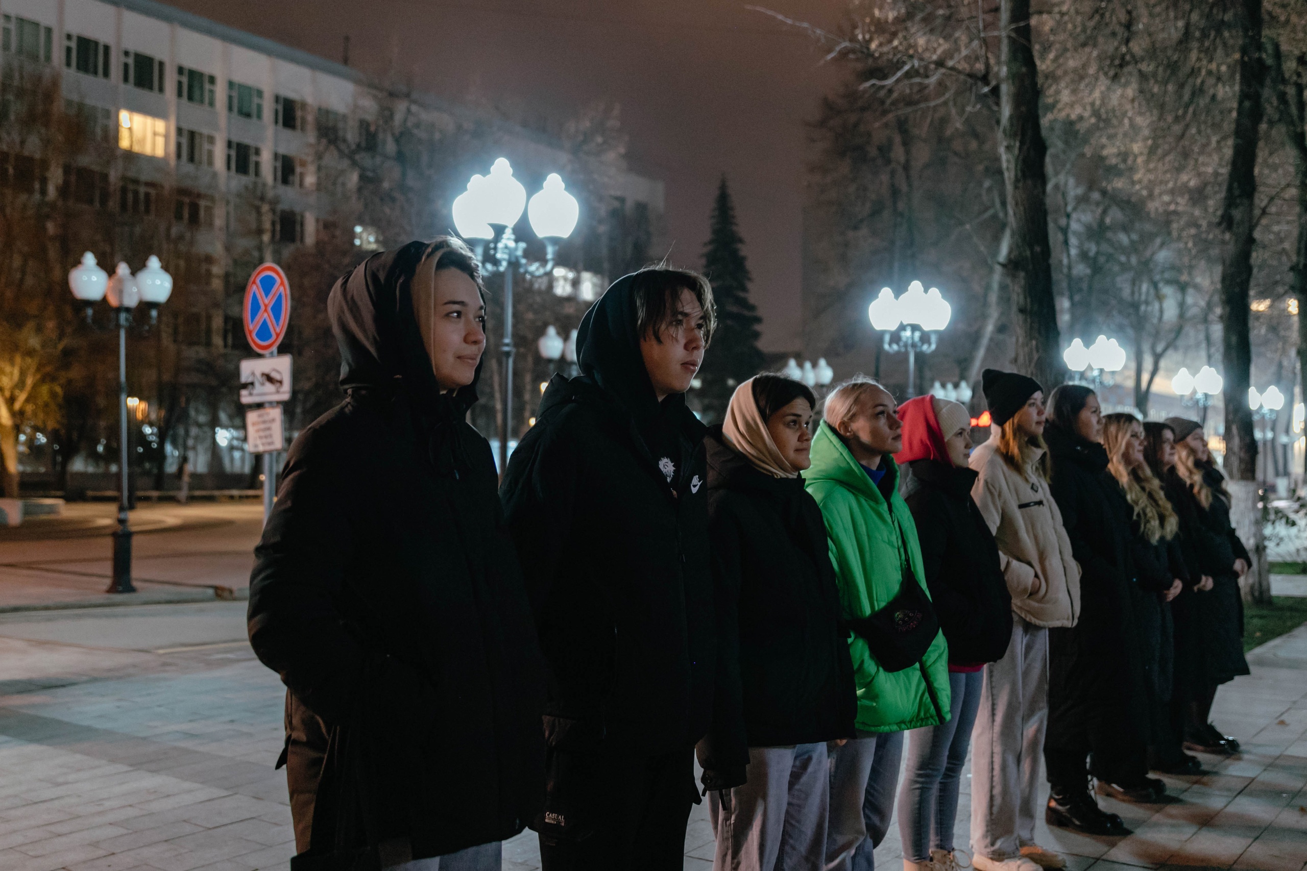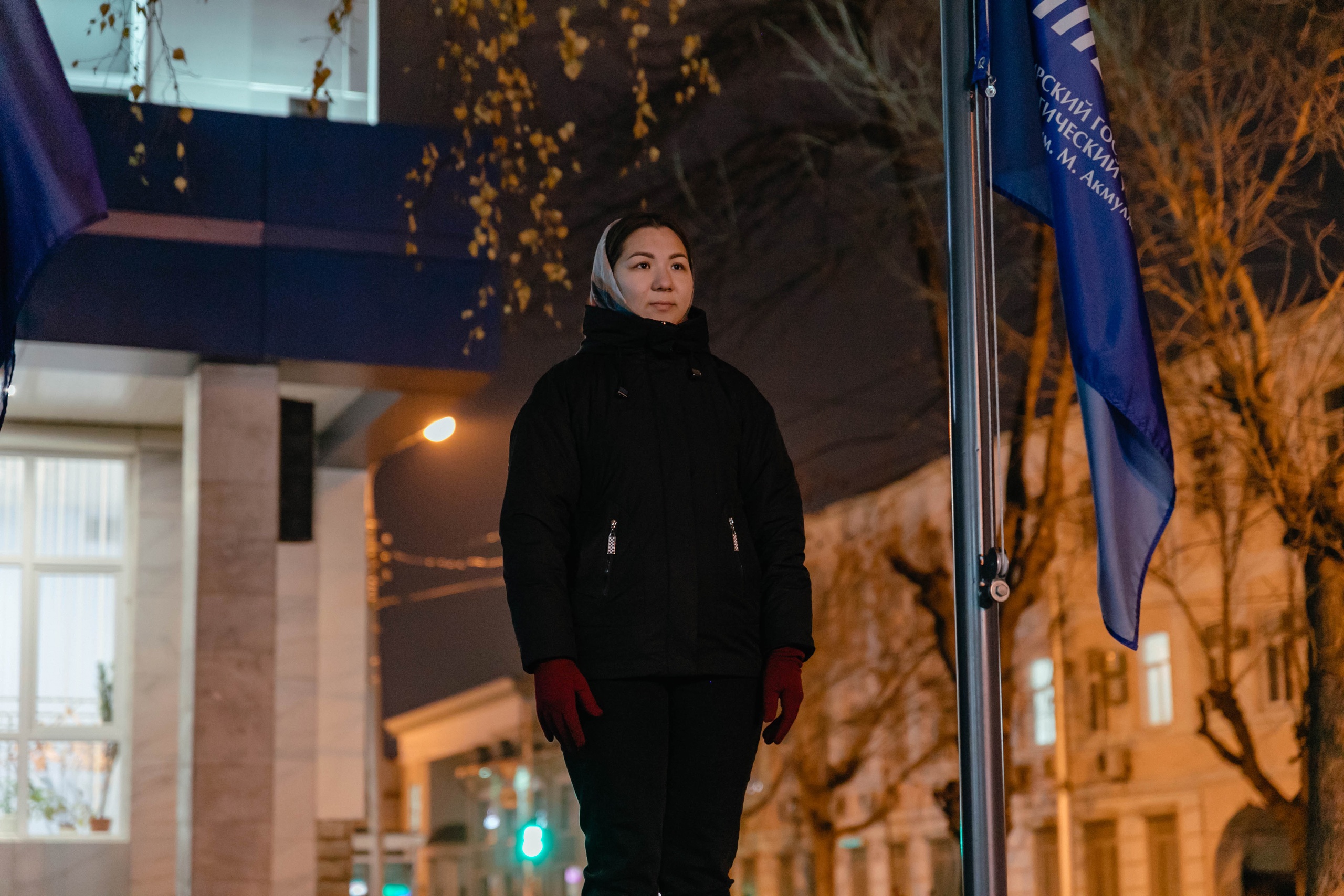 Почетное право поднять флаги предоставили активистам студенческого профсоюза Диане Галиевой, Дарье Кильбахтиной, Аиде Тикиевой и Назгуль Туктамышовой.