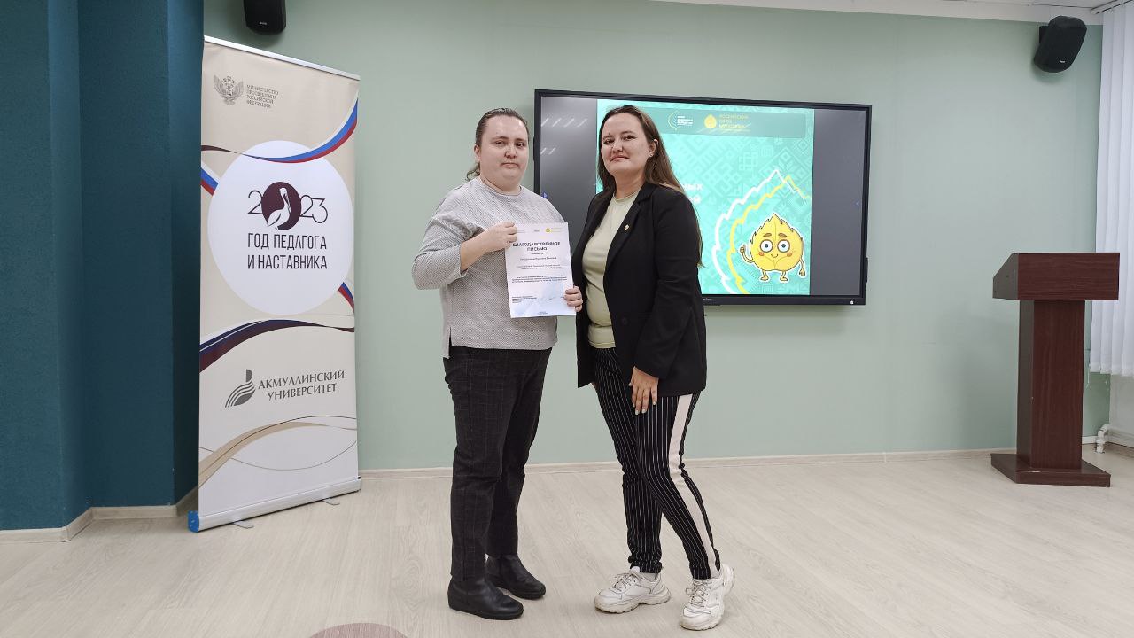 Руководитель регионального отделения Российского Союза Молодежи Элина Латипова вручила благодарственные письма РСМ в адрес ректора Акмуллинского университета Салавата Сагитова проректору вуза по научно-исследовательской работе Светлане Гареевой, главному специалисту-эксперту отдела государственной итоговой аттестации Минобрнауки РБ Ирине Ивановой и руководителю Центра менеджмента качества БГПУ имени М. Акмуллы Галие Гильмановой.