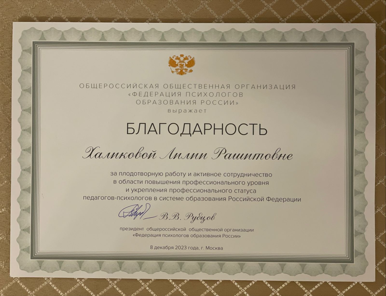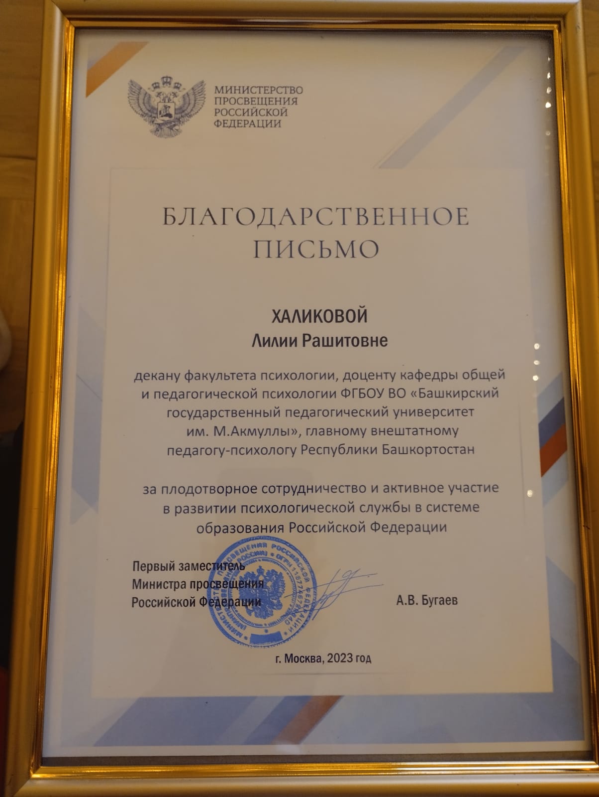 В заключении первого дня Всероссийского съезда за особые заслуги и личный вклад в развитие психологической службы в системе образования были награждены специалисты в области психологии образования. Декан факультета психологии Акмуллинского университета Лилия Халикова была награждена благодарственным письмом Министерства просвещения РФ за подписью первого заместителя министра просвещения РФ Александра Бугаева и благодарностью общероссийской общественной организации «Федерация психологов образования России», подписанной президентом Федерации Виталием Рубцовым.