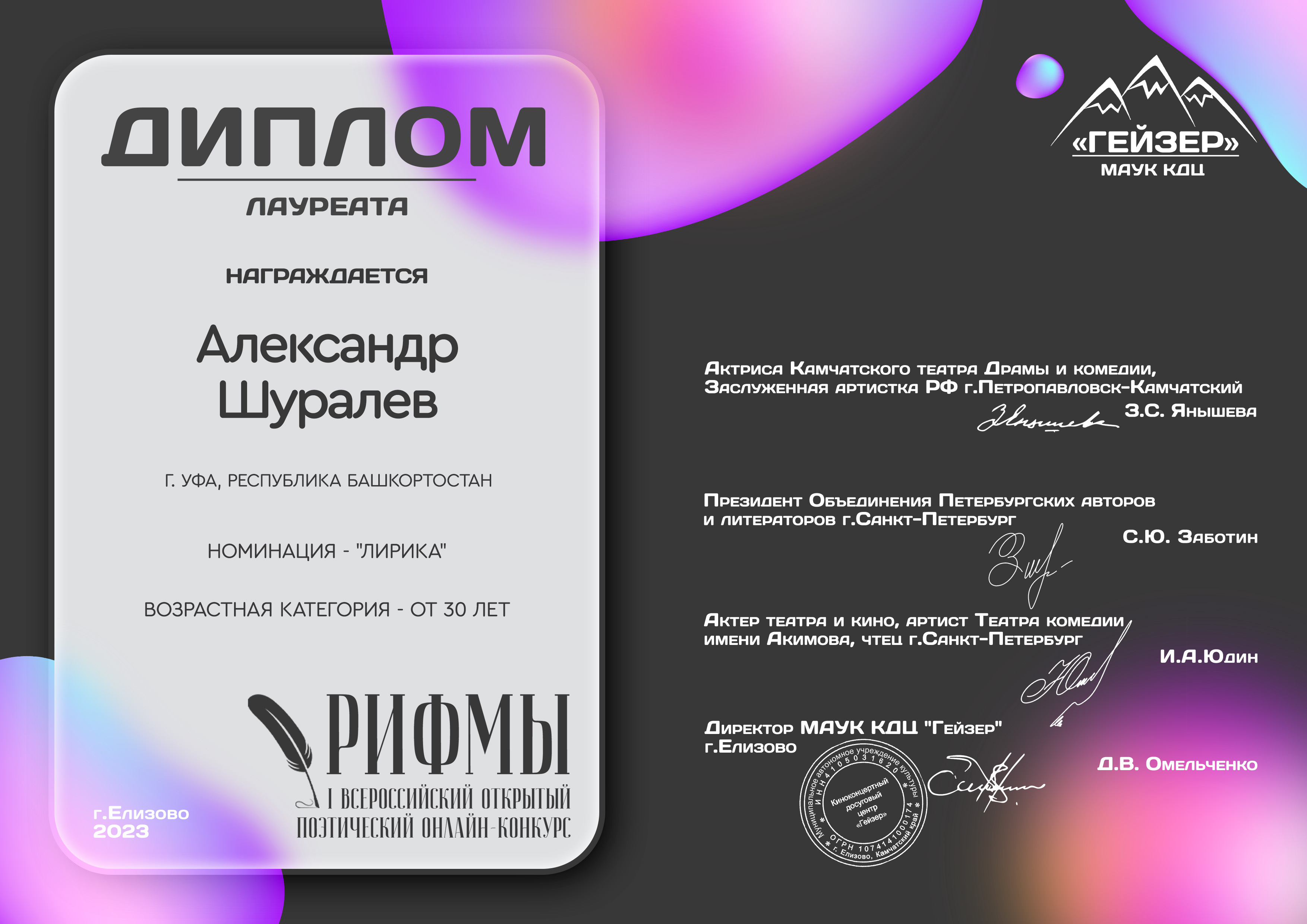 В городе Елизово (Камчатский край) состоялся I Всероссийский открытый поэтический онлайн-конкурс «Рифмы», организованный объединением петербургских авторов и литераторов совместно с деятелями культуры Камчатского края.