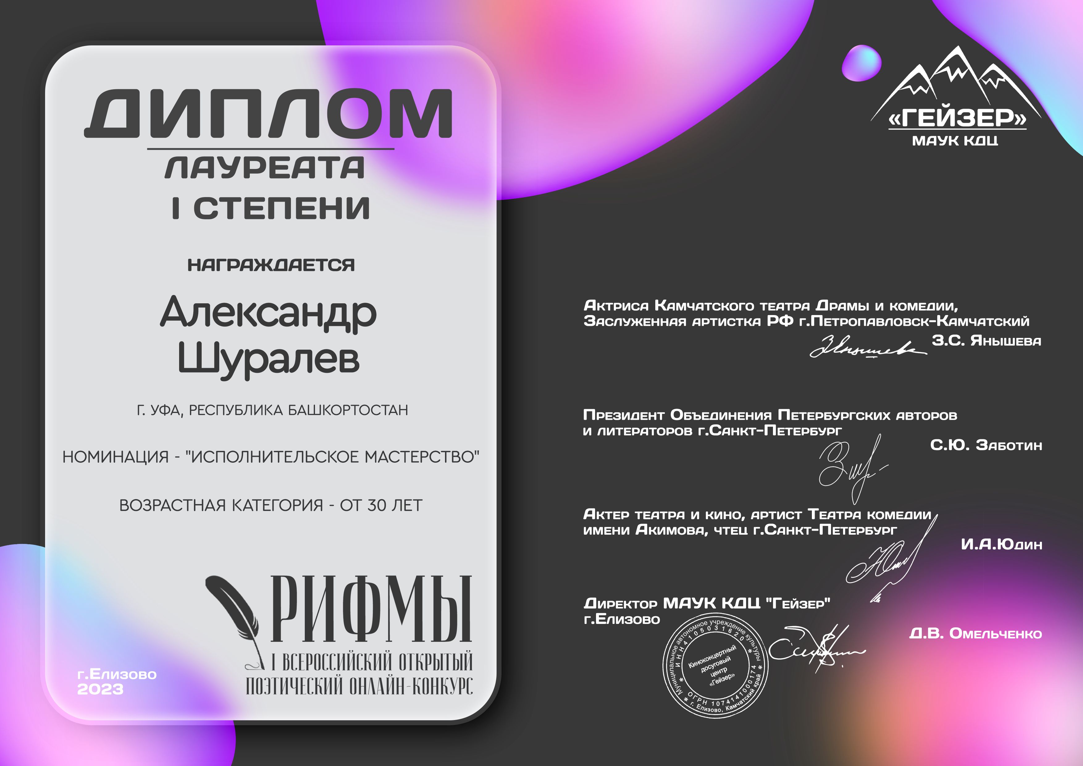 Александр Шуралев стал одним из лауреатов в номинации «Лирика», а также был удостоен звания лауреата I степени в номинации «Исполнительское мастерство».