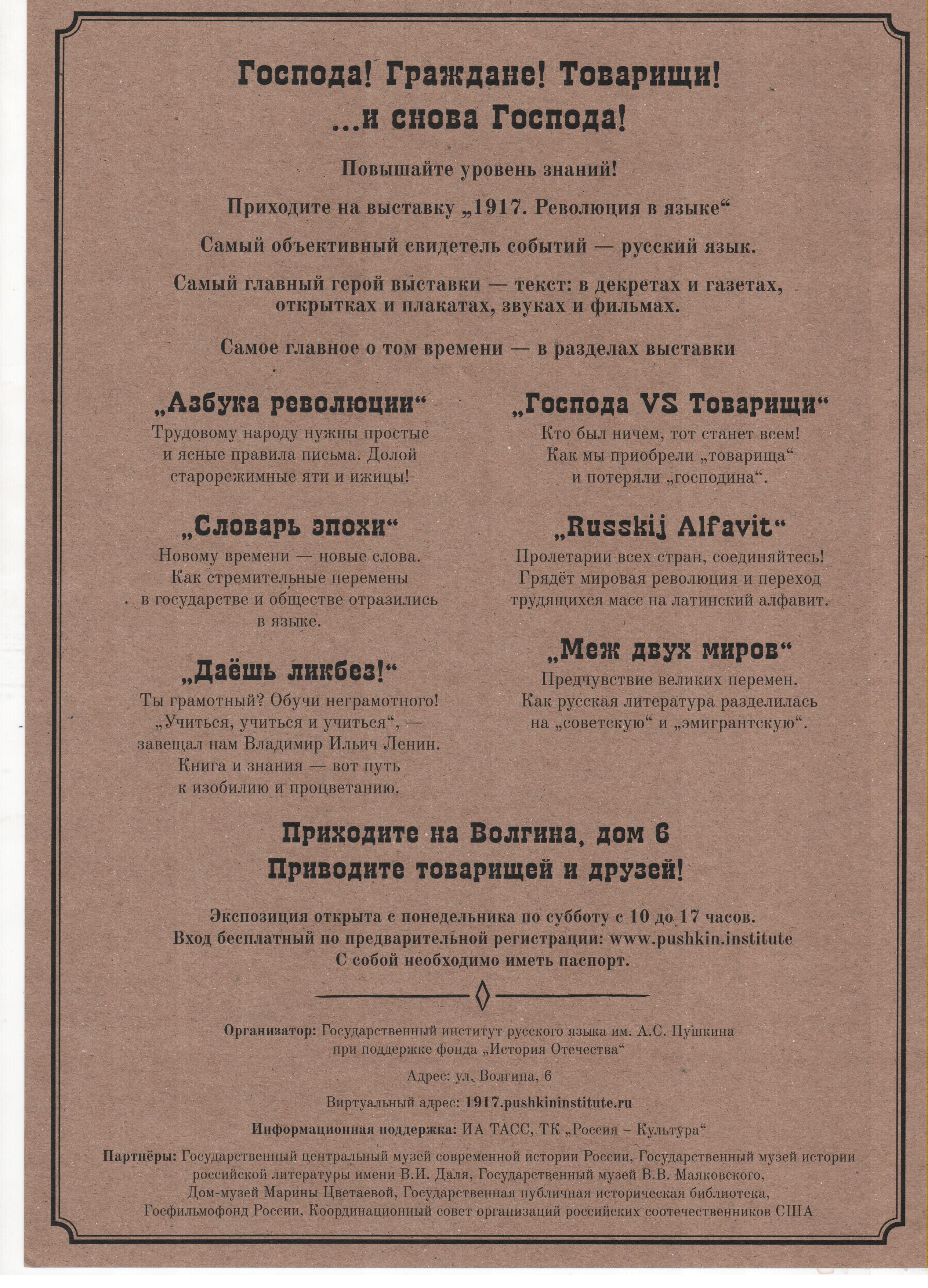 В рамках Ассамблеи прошло открытие экспозиции «1917. Революция в языке». Необходимо отметить, что организаторы выставки очень точно выдержали стилистику эпохи начала 20 века. Даже приглашения были напечатаны на обёрточной бумаге с использованием шрифта революционных газет. Экспозиция, несомненно, познавательна и полезна молодёжи, изучающей историю развития русского языка.