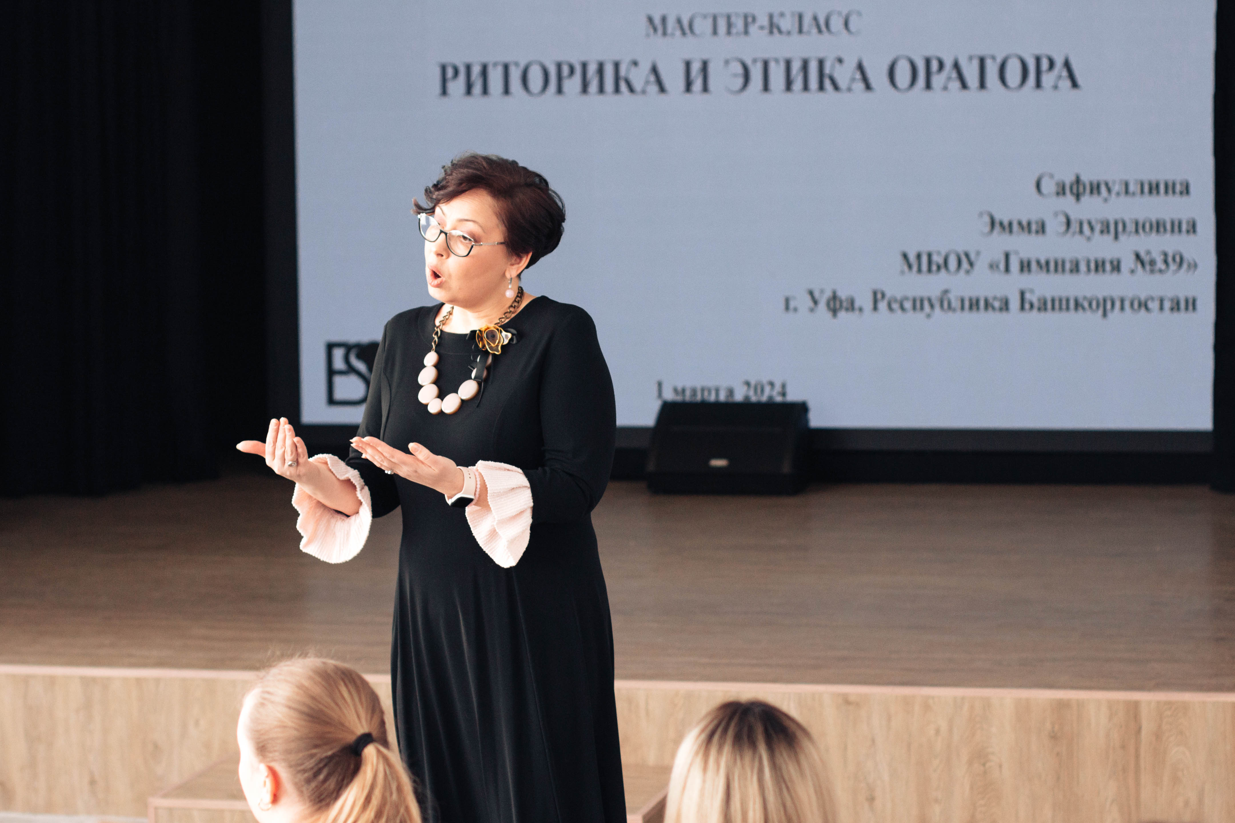 Учитель английского языка гимназии № 39,  лауреат Всероссийского конкурса «Учитель года России — 2018» Эмма Сафиуллина рассказала про риторику и этику оратора. На занятии были изучены основные принципы ораторского мастерства. Учителя приняли участие в упражнениях по отработке навыков публичных выступлений.  Кульминацией занятия стали дебаты, не оставившие никого равнодушными. Все участники мастер-класса высказали благодарность Эмме Эдуардовне за новые знания и навыки, актуальные для всех в любой сфере деятельности. «Навык ораторской речи — один из самых нужных для работы педагога, влияющий на успех его профессиональной деятельности в целом. И обучать этому навыку может только педагог, который сам достиг высочайшего уровня мастерства в работе с аудиторией», – подчеркнула Эмма Сафиуллина.