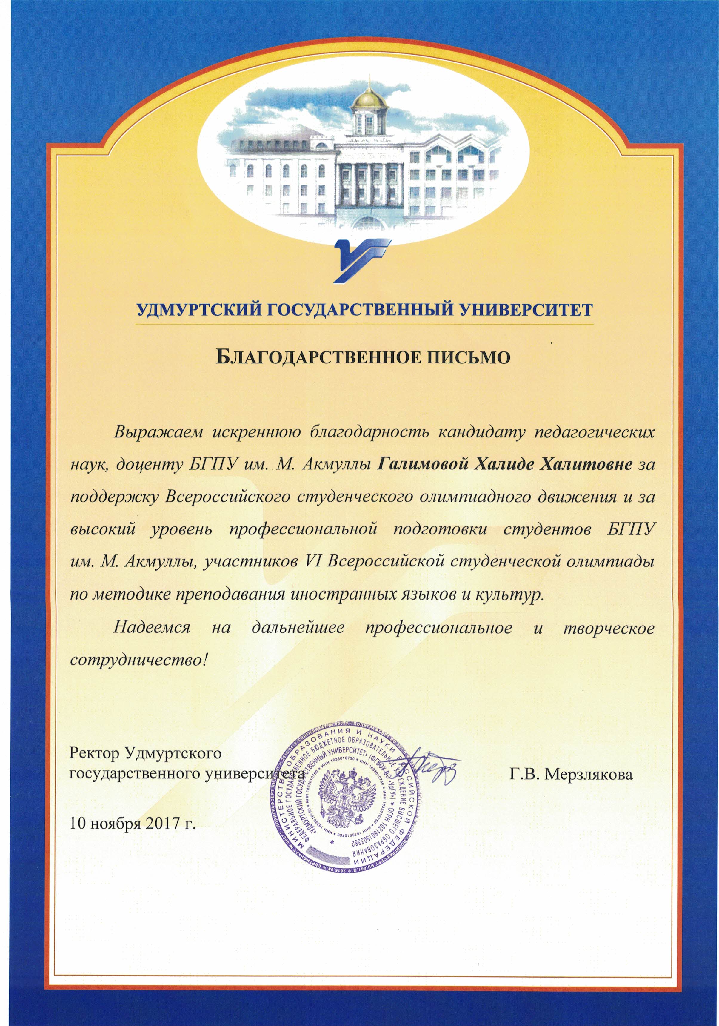 С 7 по 10 ноября 2017 года Институт иностранных языков и литературы Удмуртского государственного университета (г. Ижевск) в шестой раз собрал финалистов олимпиады – студентов старших курсов языковых факультетов более 20 вузов Российской Федерации. В их числе оказалась также студентка 5 курса ИФОМК Ибатуллина Гузель, которая провела в рамках финального этапа открытый урок со студентами УдГУ на тему «Путешествие во франкофонию», подготовленный под руководством кандидата педагогических наук, доцента кафедры методики преподавания иностранного языка и второго иностранного языка Хасановой Р. Ф.