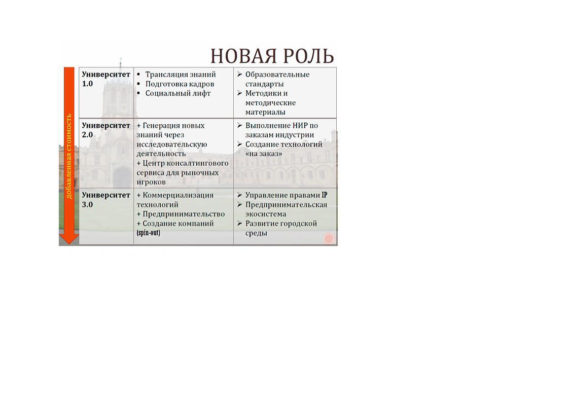Университет 3.0 - новый тип университета, выполняющий не только образовательные и исследовательские функции, но и функции интегратора основных процессов внутри экосистемы инноваций: университет должен активно участвовать в процессах, связанных с технологическим предпринимательством, развитием бизнесов, формированием новых рынков. Переход от Университета 1.0 и 2.0 к Университету3.0 – это наращивание и развитие сервисов.