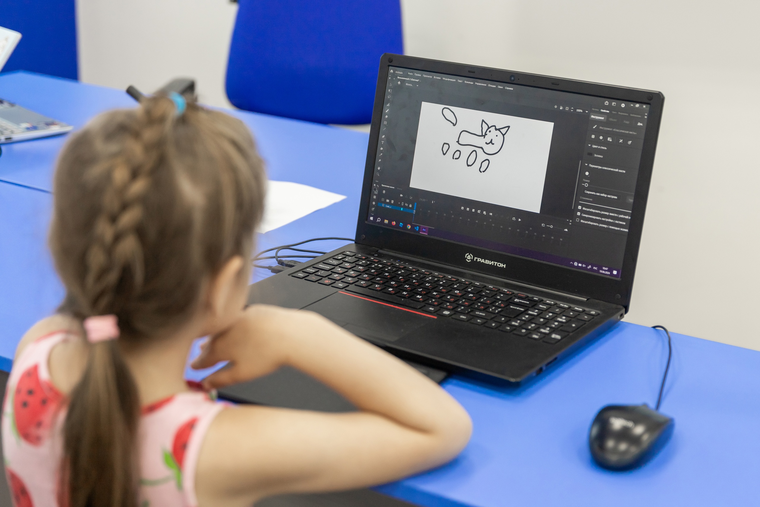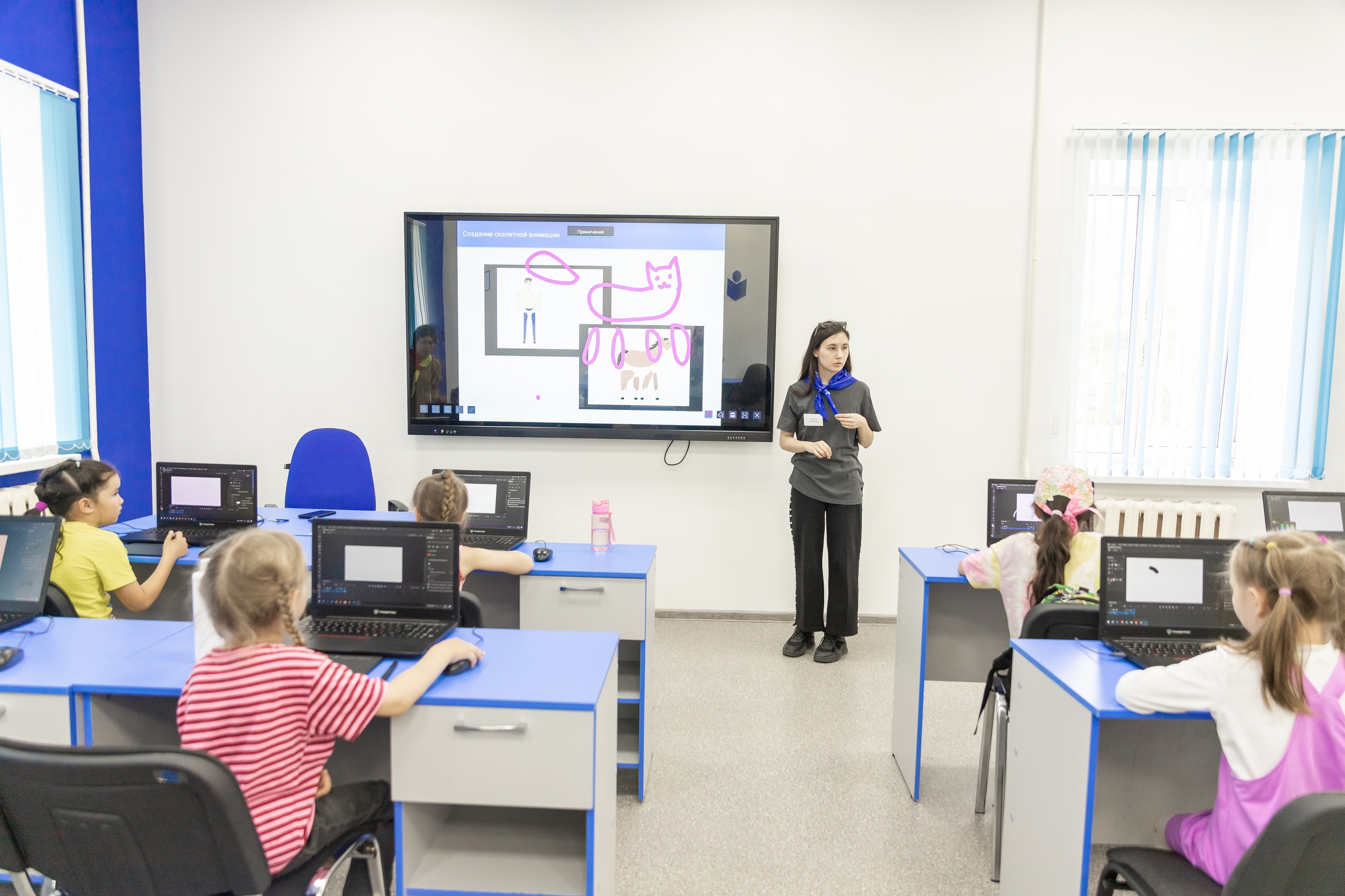 Студентка колледжа Снежана Бурлакова проводит для школьников занятия по графическому дизайну и анимации. «На занятии ребята рисуют собственного персонажа, делают ему скелет и учатся двигать фигурку. Они делают очень-очень много маленькх фрагментов, которые мы монтируем в большой видеоряд, накладываем музыку, и получается, собственно, целый мультик. Так мы знакомим ребят с профессией аниматора», – рассказывает она.