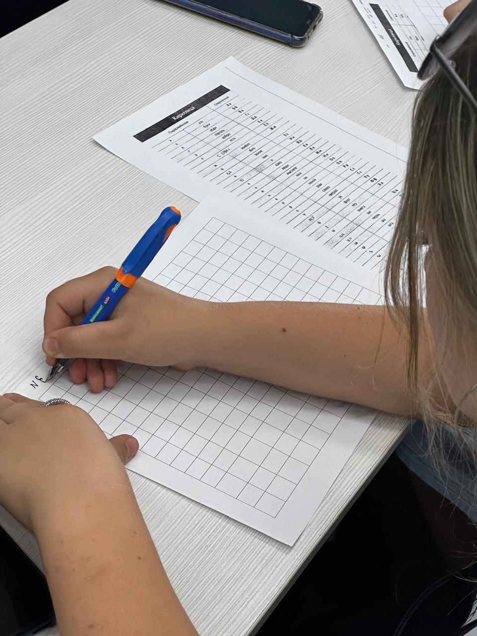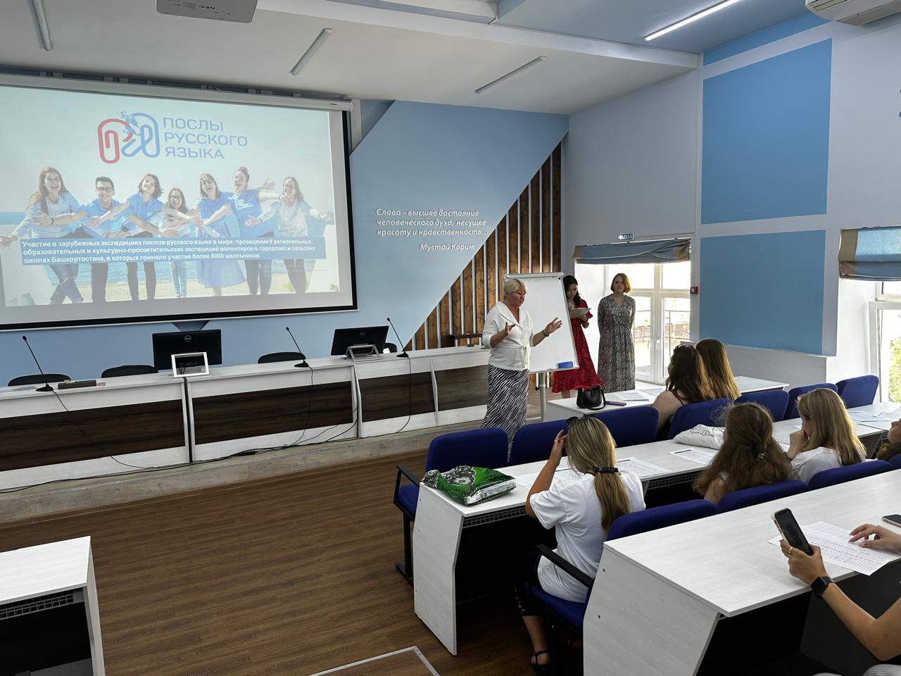 БГПУ им.М.Акмуллы в данном проекте представляет Международный  центр изучения и продвижения русского языка имени М. Карима. Профессор Гульнара Кудинова рассказала ребятам о современных филологических исследованиях, роли филологов в глобальном образовательном пространстве, а студенты 3 курса профиля «Русский язык и литература» Галина Калаганова и Аделина Сагадеева провели для школьников  мастер-класс по каллиграфии на старославянском языке.  Гости написали чернильными перьевыми ручками свои имена и фамилии старославянским шрифтом, а победитель конкурса получила приз.
