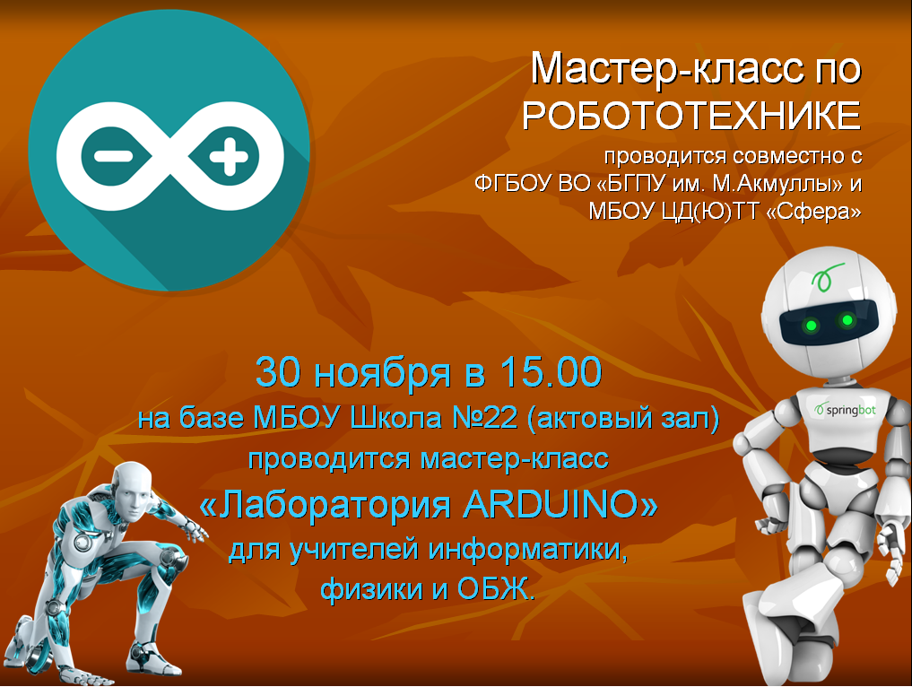 30 ноября 2017 года на базе МБОУ ДО ЦД(Ю)ТТ «Сфера» в рамках инновационного проекта по формированию гармоничной личности с технически ориентированным мышлением «Техносфера» преподавателем  кафедры информационных систем и технологий ИПОиИТ ФГБОУ ВО БГПУ им. М. Акмуллы, к.ф.-м.н. Исхаковым Алмазом Раилевичем проведен мастер-класс «ЛАБОРАТОРИЯ ARDUINO» для учителей физики, информатики и учащихся школ района: МБОУ Школа № 126, МБОУ «Лицей № 5», МБОУ Школа № 41, МБОУ Школа № 14, МБОУ «Лицей № 160», МБОУ Школа № 22. Также приняли участие обучающиеся и педагоги объединений МБОУ ЦД(Ю)ТТ «Сфера»: «Прикладная робототехника» (Электроника, робототехника, основы программируемой микроэлектроники), «Электрокласс». Инновационный проект «Техносфера» способствует активному вовлечению участников в деятельность по обмену технической информацией и инженерными знаниями, реализации инновационных разработок в области образовательной робототехники, развитию новых научно-технических идей, что позволит ускорить подготовку инженерных кадров.  Мероприятие было посвящено интересному устройству Arduino (Ардуино). Участники познакомились с возможностями этой вычислительной платформы. Алмаз Раилевич представил примеры проектов с использованием Ардуино, а также свой опыт работы с ним. В окончании мероприятия, заинтересованные участники смогли пообщаться, обсудить идеи сотрудничества. Всех этих людей объединяло одно – интерес к использованию новых технологий. Мастер-класс прошел интересно и плодотворно. Все участники остались довольны.