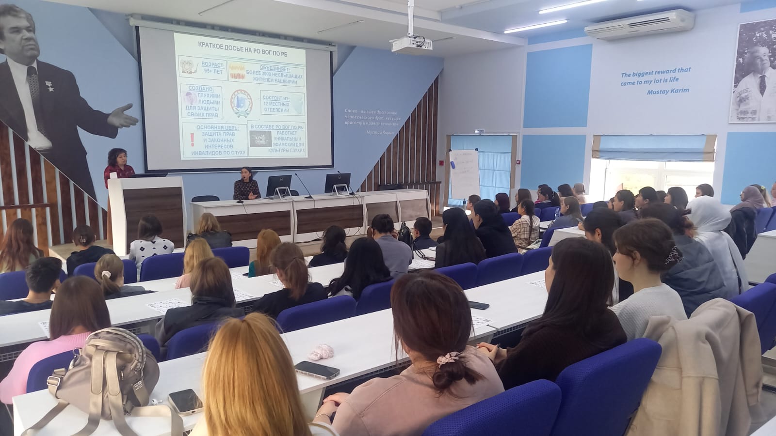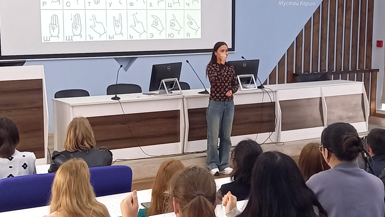 Спикером выступила заместитель председателя Регионального отделения Всероссийского общества глухих по РБ Нурия Салихова. Она рассказала студентам о неслышащих жителях республики, особенностях их коммуникации и восприятия информации, а главное, поведала будущим преподавателям об имеющихся вопросах в организации обучения детей с нарушениями слуха, существующих парадоксах действующей системы образования и о том, откуда они возникли и к каким последствиям приводят. С помощью переводчика русского жестового языка Киры Нугаевой ребята познакомились с дактильной азбукой, отдельными словами на жестовом языке, а также приняли участие во флэшмобе #башкортостанговоритнаржя, который общество глухих Башкирии запустили в республике в честь Международной недели глухих. Но, наверное, самые яркие впечатления оставило выступление артистов студии жестовой песни «Шанс» уфимского Дома культуры глухих, которые исполнили для ребят песню «Россия – это мы».