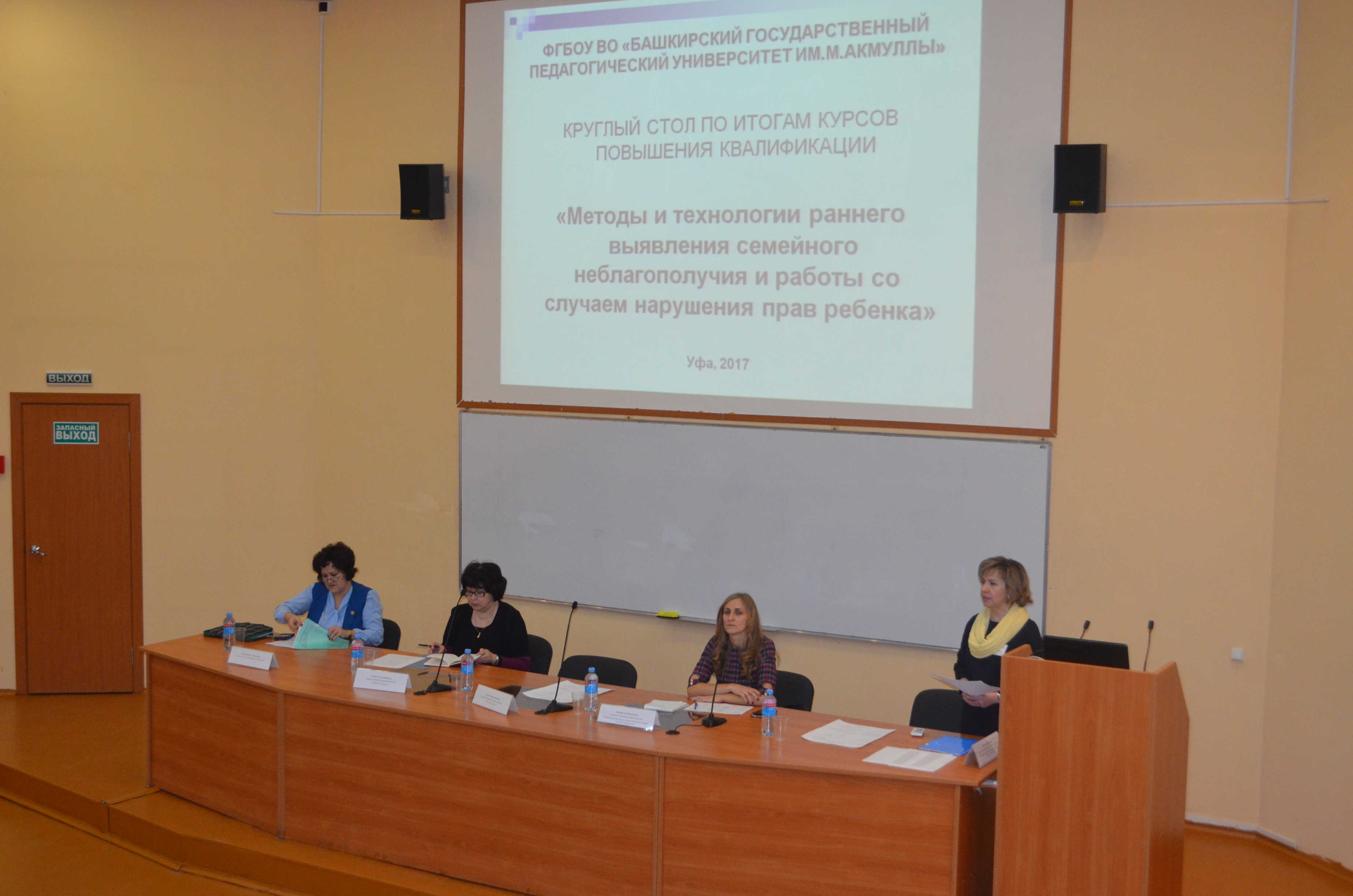 Одним из инструментов решения многочисленных проблем современной семьи является подготовка квалифицированных специалистов. Кафедра социальной педагогики в 2017 году приняла участие в конкурсе заявок на реализацию основного мероприятия «Повышение уровня квалификации кадров и системы управления» подпрограммы «Повышение качества работы и взаимодействия с населением» государственной программы «Социальная защита населения Республики Башкортостан», который был организован и проведен Министерством семьи, труда и социальной защиты населения РБ. Поданная кафедрой социальной педагогики на конкурс заявка была поддержана, что позволило организовать в ноябре-декабре 2017 года курсы повышения квалификации для специалистов Центров социальной помощи семье и детям, социальных приютов для детей и подростков по теме «Методы и технологии раннего выявления семейного неблагополучия и работы со случаем нарушения прав ребенка». Курсы были проведены в очно-заочной форме с использованием дистанционных образовательных технологий. 152 слушателя познакомились с современным состоянием проблемы семьи и детства, овладели технологией раннего выявления семейного неблагополучия и технологией работы со случаем нарушения прав ребенка.
