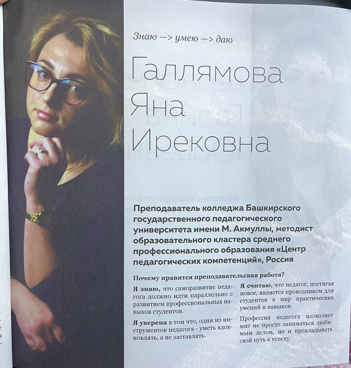 «Самым сложным для меня в этом конкурсе было пережить ту огромную ответственность, которую я чувствовала, представляя университет. Конкурс — это напряжённая борьба на всех этапах, каждый из которых требовал усиленной подготовки, огромного вложения сил. Большую трудность составляла нехватка времени. Очень важно было ощущать поддержку коллег, без этого я бы не добилась результата. Участие в конкурсе дало мне возможность познакомиться и пообщаться с единомышленниками, интересными людьми и понять, над чем необходимо работать и в каком направлении планировать своё дальнейшее развитие», – рассказала Яна Ирековна.