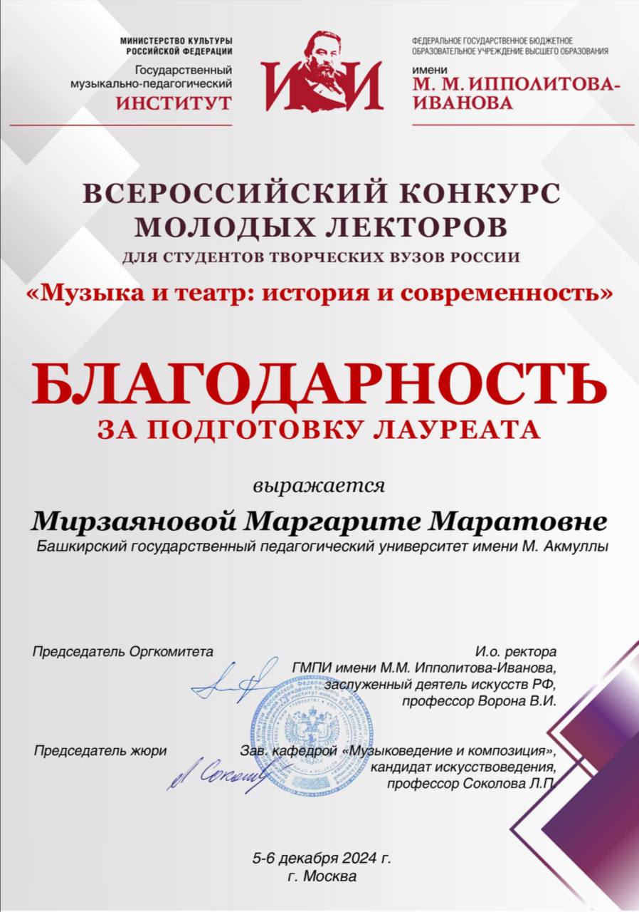 Студентка кафедры музыкального и хореографического образования, выпускница колледжа БГПУ им. М. Акмуллы Юлия Буракова приняла участие во Всероссийском конкурсе молодых лекторов среди творческих вузов, который состоялся в начале декабря в Государственном музыкально-педагогическом институте им. М.М. Ипполитова-Иванова (г. Москва). В 2024 году он был посвящен теме «Музыка и театр: история и современность».