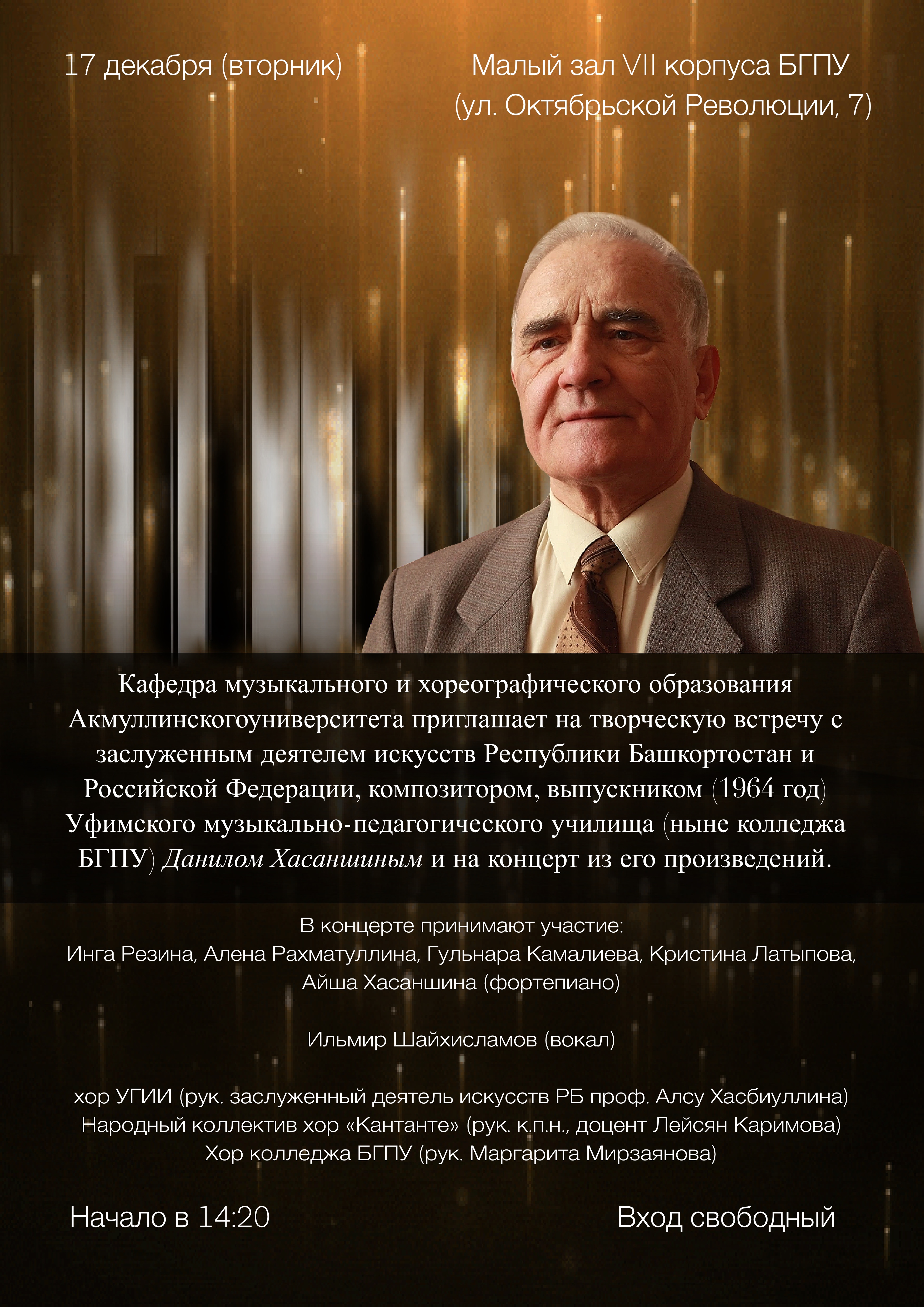 Кафедра музыкального и хореографического образования Акмуллинского университета приглашает на творческую встречу с заслуженным деятелем искусств Республики Башкортостан и Российской Федерации, композитором, выпускником Уфимского музыкально-педагогического училища (ныне колледжа БГПУ) Данилом Хасаншиным и на концерт из его произведений, который состоится 17 декабря 2024 года в 14.20 часов в Малом концертном зале учебного корпуса №7.