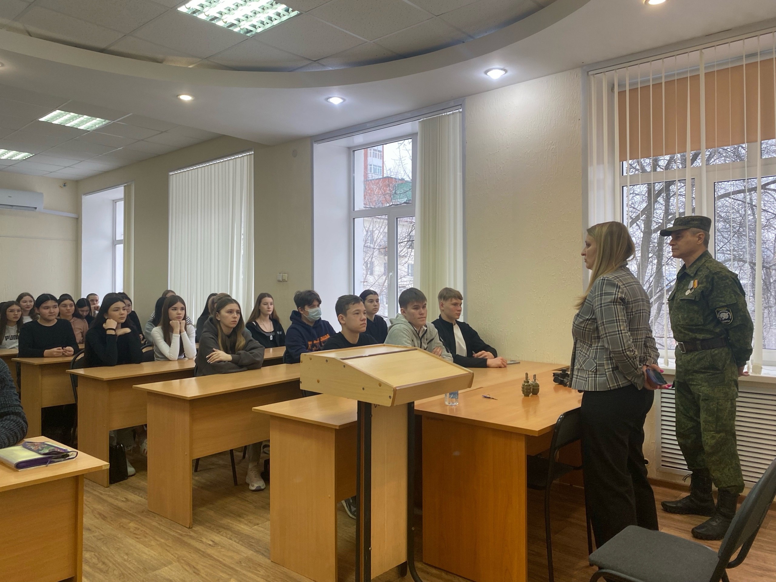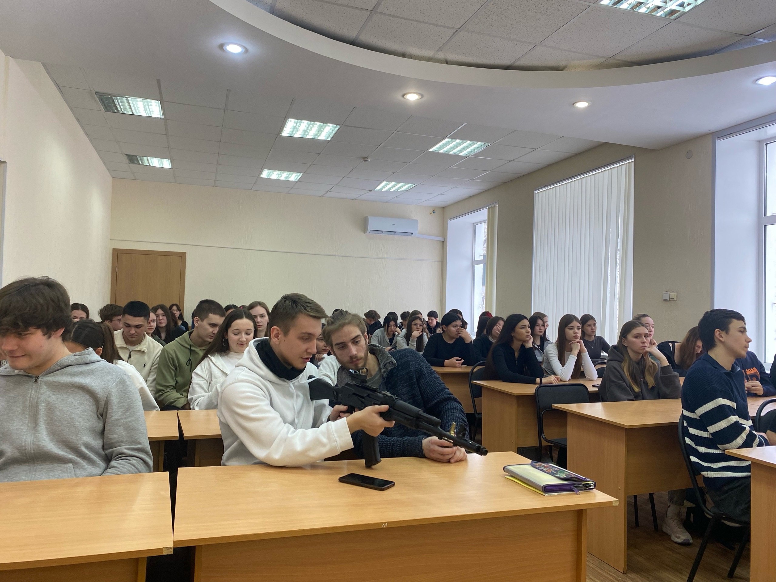 Роберт Даудович рассказал о своем боевом опыте, поделился историями из жизни и напомнил студентам о важности любви к Родине. Он показал презентацию об СВО, ответил на вопросы студентов, касающиеся боевых наград, боев, личной жизни. Ветеран принес с собой специальные приспособления для огнестрельного оружия, гранаты, магазины с боевыми патронами и продемонстрировал студентам, как превратить простой АК-74 в оружие, отвечающий всем требованиям современного боя.