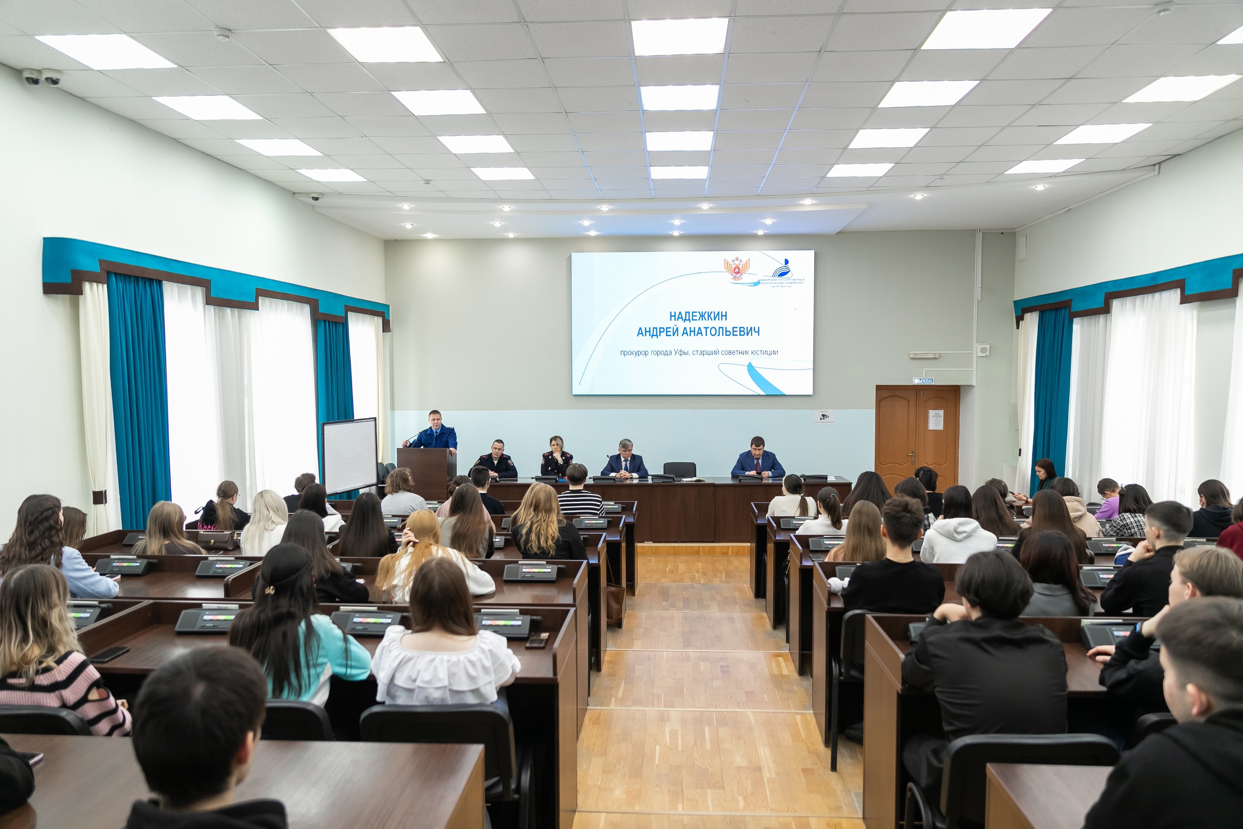 12 февраля в БГПУ имени М. Акмуллы прошла встреча студентов с представителями органов правопорядка. Поговорить с учащимися о противодействии терроризму, экстремизму и мошенничеству пришли прокурор города Уфа, старший советник юстиции Андрей Надежкин, начальник уголовного розыска отделения полиции №9 г.Уфы Ильмир Гайзетдинов и  полковник полиции Оксана Шарипова, заместитель начальника Управления по работе с личным составом МВД по РБ.
